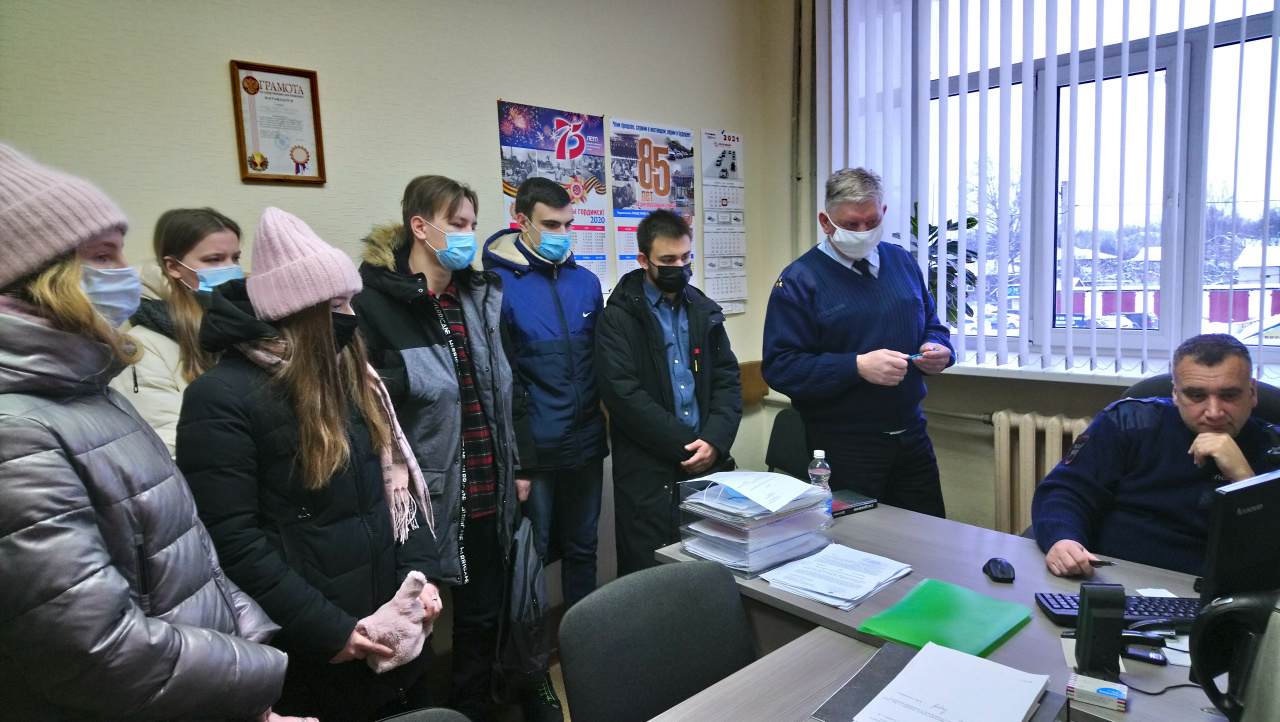 22 января студенты посетили Управление ГИБДД УМВД России по Ивановской области. Инспектор отделения пропаганды безопасности дорожного движения В.В. Тынич рассказала о структуре этого Управления и основных направлениях деятельности сотрудников «дорожной полиции». Со студентами провел беседу также начальник Центра автоматизированной фиксации административных правонарушений А.Ю. Якушев, который затронул вопросы функционирования системы видеофиксации нарушений правил дорожного движения в Ивановской области. После этого студенты в составе экипажей дорожно-постовой службы на автомобилях ГИБДД проследовали по маршрутам дежурства инспекторов на улицах областного центра.