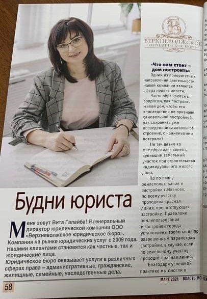 Компания, возглавляемая В.А. Галайбой, существует уже более 10 лет, оказывая юридические услуги по самым разным категориям дел – административным, гражданским, жилищным, семейным, трудовым и т.д. Сама В.А. Галайба является выпускницей исторического и юридического факультетов ИвГУ. После окончания обучения Вита Александровна в течение нескольких лет преподавала на кафедре теории и истории государства и права, но с самого начала совмещала теорию преподавания юридических дисциплин с практикой. Работала юристом в строительной компании, затем возглавила юридический отдел, а потом решила заняться собственной юридической практикой, открыв в 2009 г. юридическое бюро.