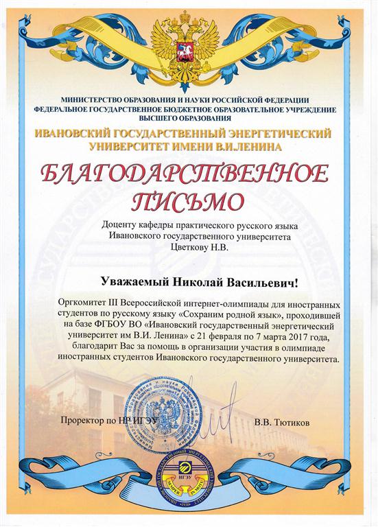 Отдельные благодарности за организацию и проведение олимпиады были вручены и преподавателям кафедры практического русского языка ИвГУ: канд. филол. наук, доценту Цветкову Н. В. и канд. филол. наук, доценту Мельниковой А. Ю.