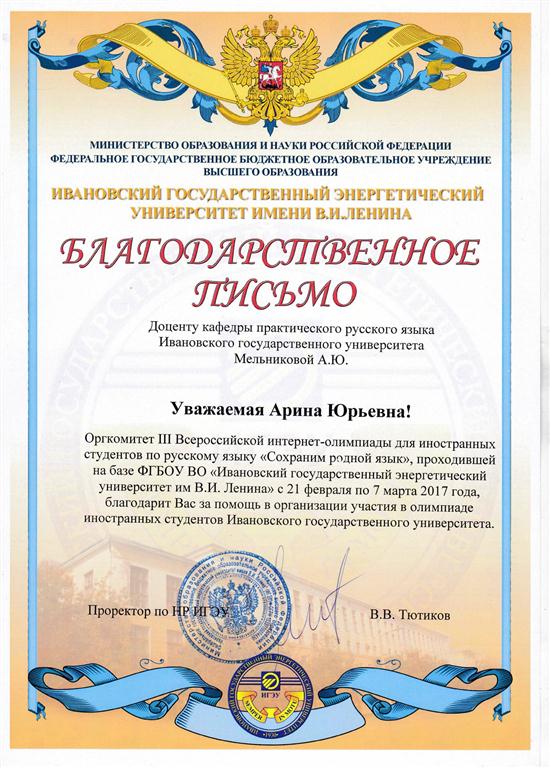 В марте этого года на базе ФГБОУ ВО «Ивановский государственный энергетический университет имени В. И. Ленина» была проведена III Всероссийская интернет-олимпиада для иностранных студентов по русскому языку «Сохраним родной язык», в которой, как и в прошлом году, приняли участие несколько бакалавров (нефилологов) первого и второго курсов Ивановского государственного университета. К сожалению, призовые места наши студенты не заняли, однако студентка третьего курса социолого-психологического курса Тэмуулэн Тугулдур, участвовавшая на внеконкурсной основе, успешно справилась со всеми заданиями и получила благодарность.
