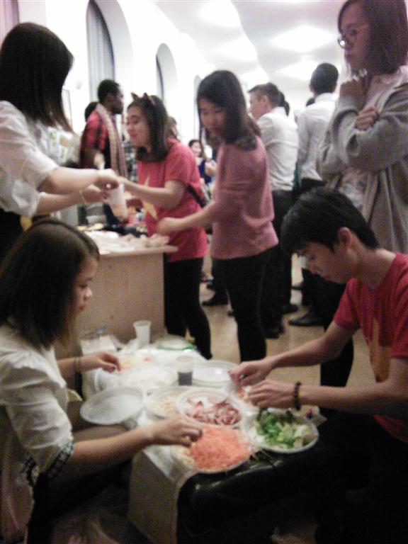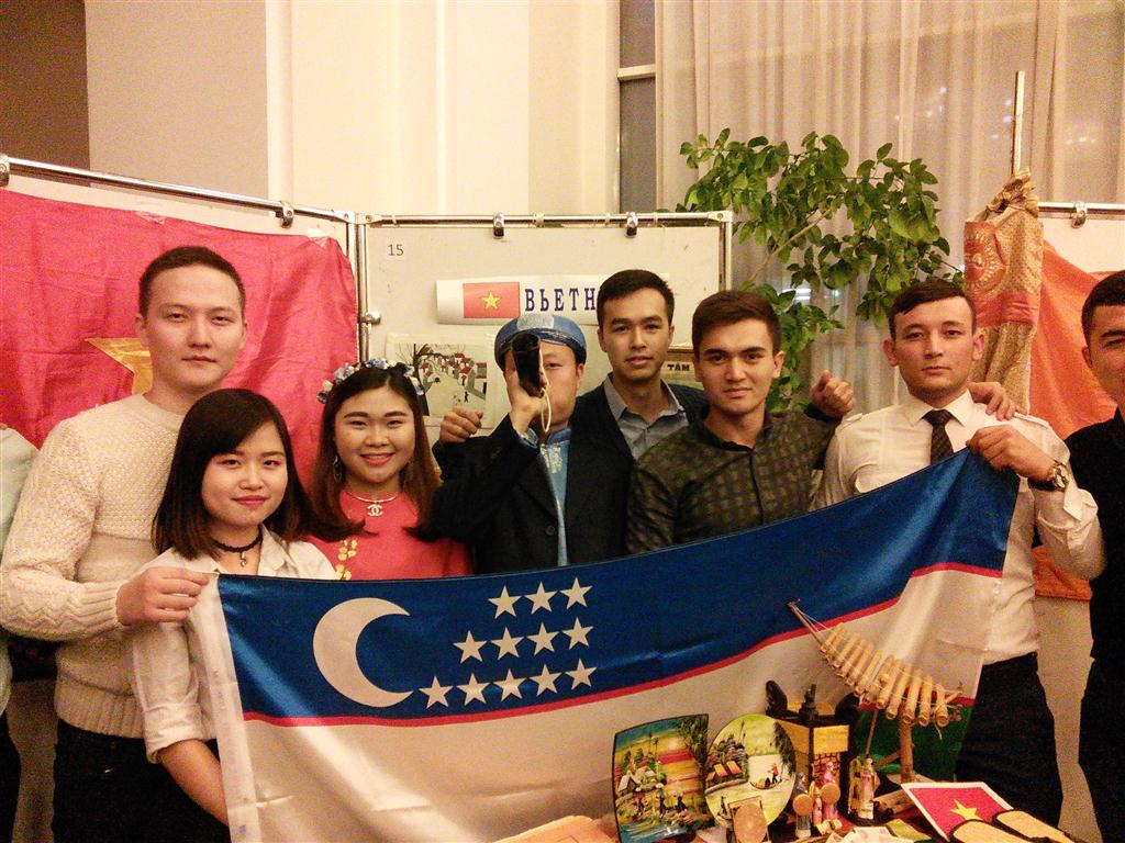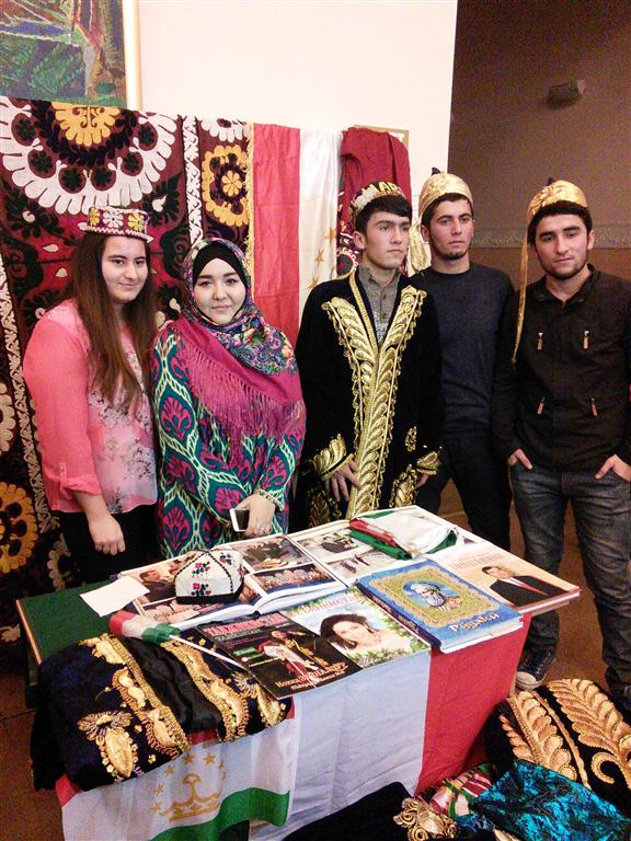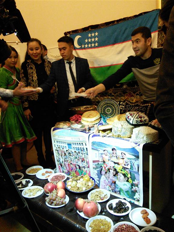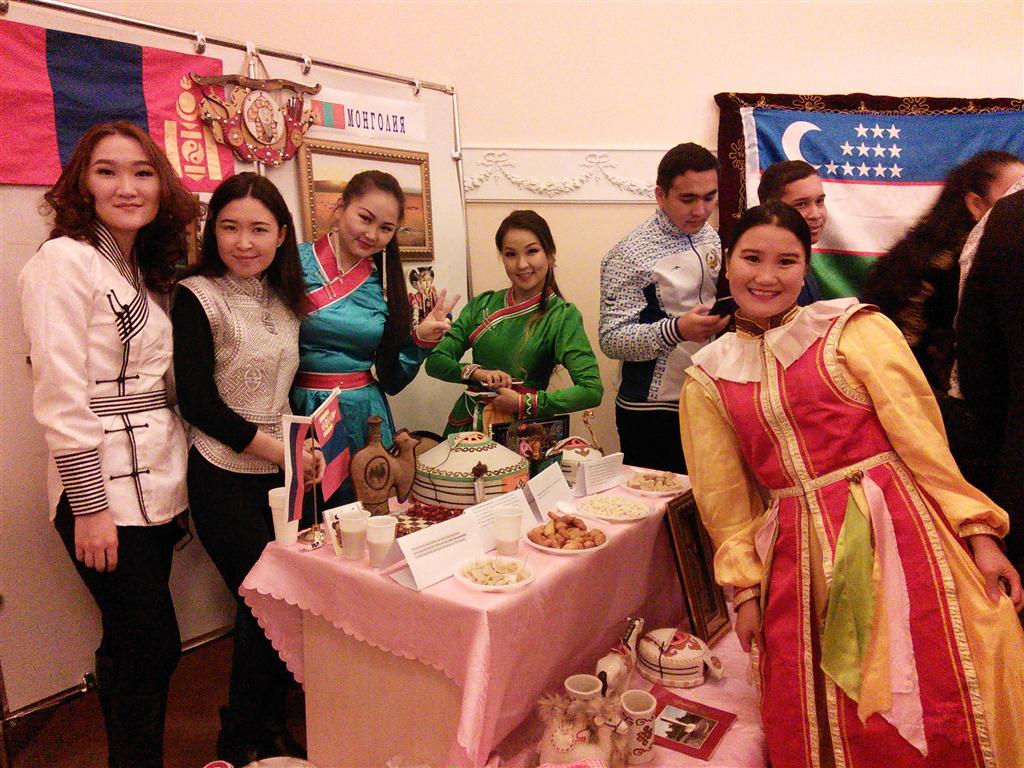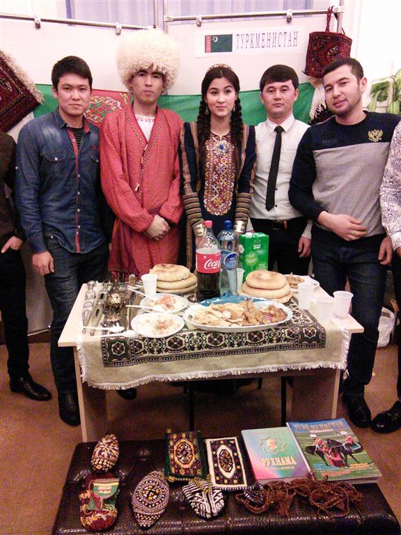 Можно представить, какой груз ответственности лег на плечи наших ребят, ведь нужно было ярко и колоритно представить культуру своей страны: показать предметы одежды, быта, связанные с теми или иными традициями и обычаями, блюда национальной кухни и многое другое. Нашим ребятам это удалось в полной мере, так как невозможно перечислить всего того изобилия, которое было на их столах. Помимо красочных ковров, яркой одежды, украшений, музыкальных инструментов, игрушек и прочего, каждая из наших стран-участниц приготовила большое количество вкусных угощений. Например, ребята из Туркменистана, Узбекистана и Сенегала порадовали гостей своими вариантами национального плова, которые, конечно же, существенно различались, но все были превосходными. Студенты из Вьетнама впечатлили присутствующих своими интересными роллами, печеньем из рисовых хлопьев, экзотическими острыми соусами. Монгольские студентки также приготовили пикантные блюда: cухой творог разных видов, сладости и другие блюда. Впервые за долгие годы в выставке участвовали студентки из Боснии и Герцеговины, которые также всех удивили своим сербским пирогом (питой), творогом и уштипцицами. Ну а конголезцы приготовили пончики, которыми щедро угостили всех гостей. В этой связи хотим выразить особенную благодарность тем студентам, которые были назначены ответственными за организацию выставочных столов своих стран: Чубрилович Бояну (Босния и Герцеговина), Энхжаргал Галтхуу (Монголия), Азамову Махфузу (Узбекистан), Кувалакову Сапаргул (Туркменистан), До Хоанг Лонга (Вьетнам), Адама Салл (Сенегал), Мбуала Беа Рут Моксиан (Конго). Они настоящие молодцы, так как постарались сделать выставку веселой, красочной, сытной и незабываемой.