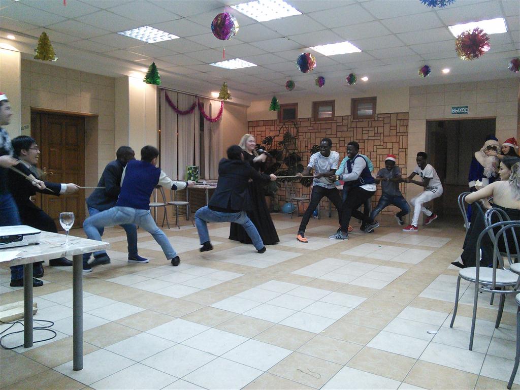 Во время концерта было множество приятных сюрпризов. Особенно всем присутствующим понравились подвижные и интересные конкурсы: ребятам нужно было вовремя «впрыгнуть в Новый год» и т.д. Студенты смогли познакомиться и с русскими традициями, приняв участие в национальных забавах: например, молодым людям понравилось на скорость забивать гвозди и перетягивать канат, а девушкам запомнился конкурс с коромыслом и ведрами воды. Все участники конкурсов получили хорошие новогодние призы.