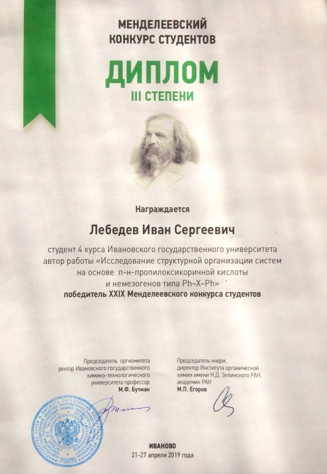 Участники прошли несколько этапов отбора: заочный и очный тур. Очный этап конкурса проходил с 21 по 27 апреля на базе ИГХТУ и включал стендовую сессию и устные доклады. До финального тура дошли лишь 40 участников из числа заявленных на первом этапе конкурса, среди них студент 4-го курса биолого-химического факультета Иван Сергеевич Лебедев. Его работа на тему «Исследование структурной организации систем на основе п-н-пропилоксикоричной кислоты и немезогенов типа Ph–X–Ph» была удостоена диплома III степени. Ивану также был вручен сертификат химико-биологического кластера «SCAMT».