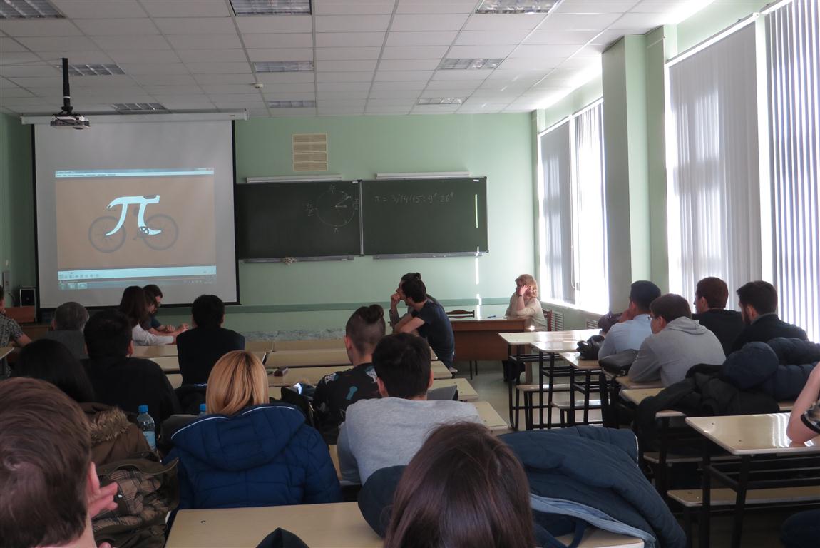 После вступительного слова декана факультета Б.Я. Солона присутствующие просмотрели небольшой фильм о числе ПИ. Затем состоялась дискуссия в формате «Тёрки» на тему «Нужна ли математика гуманитариям». Две позиции «Нужна» и «Не нужна» отстаивали, соответственно, команды «Матисты» и «Пифагоры». Команду «Матисты» составили третьекурсники Малеев В., Морозов С. и Ковтунов И., команду «Пифагоры» – студенты Мерков С., Михальченко С. и Захарова Т. В жюри вошли зам.декана Е.В. Ерёмина, декан Б.Я. Солон и студентка Влада Марченко. Кстати, последняя уверенно контролировала и ход дискуссии, и поведение зала.