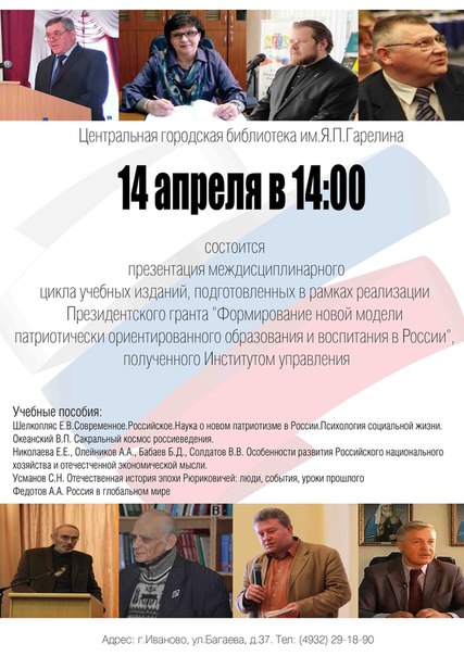 Доктор исторических наук, профессор Ивановского филиала Института управления Алексей Александрович Федотов и председатель Президиума Ивановского регионального отделения Общества «Знание» России доктор экономических наук, профессор Сергей Сергеевич Мишуров проинформировали о ходе реализации Институтом управления Президентского гранта «Формирование новой модели патриотически ориентированного образования и воспитания в России». В числе результатов — издание цикла учебных пособий для дополнительного образования по истории, экономике, психологии и культурологии. Эти учебные пособия, а также вышедший в рамках гранта спецвыпуск научного журнала «На пути к гражданскому обществу», были переданы Ивановской городской Думе и Центральной городской библиотеке им. Я. П. Гарелина.
