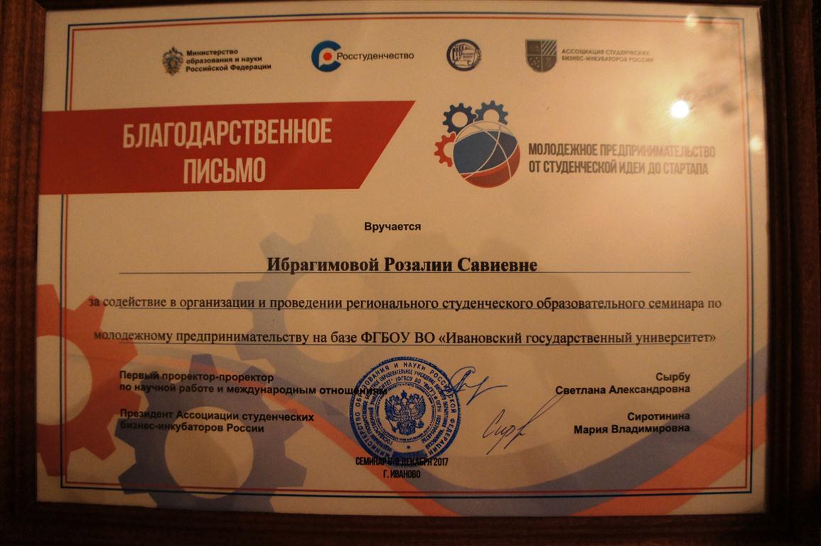 Зав. кафедрой ЭиОП Ибрагимова Розалия Савиевна была награждена благодарственным письмом за содействие в организации и проведении семинара.