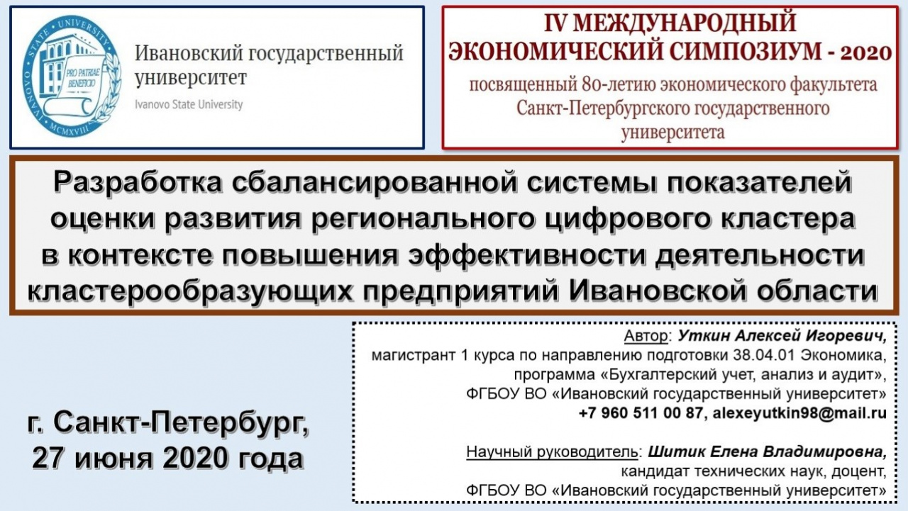 От Ивановского государственного университета в Международной конференции молодых ученых-экономистов «Развитие современной экономики России» в рамках IV Международного Экономического Симпозиума – 2020 принимал участие Алексей Уткин, магистрант 1 курса экономического факультета по направлению подготовки 38.04.01 Экономика, образовательная программа «Бухгалтерский учет, анализ и аудит». На секции «Трансформация задач и инструментов управления организацией в контексте развития цифровой экономики» наш магистрант выступил с докладом на тему «Разработка сбалансированной системы показателей оценки развития регионального цифрового кластера в контексте повышения эффективности деятельности кластерообразующих предприятий Ивановской области». Научный руководитель – кандидат технических наук, доцент кафедры экономического анализа и бухгалтерского учета Шитик Елена Владимировна.