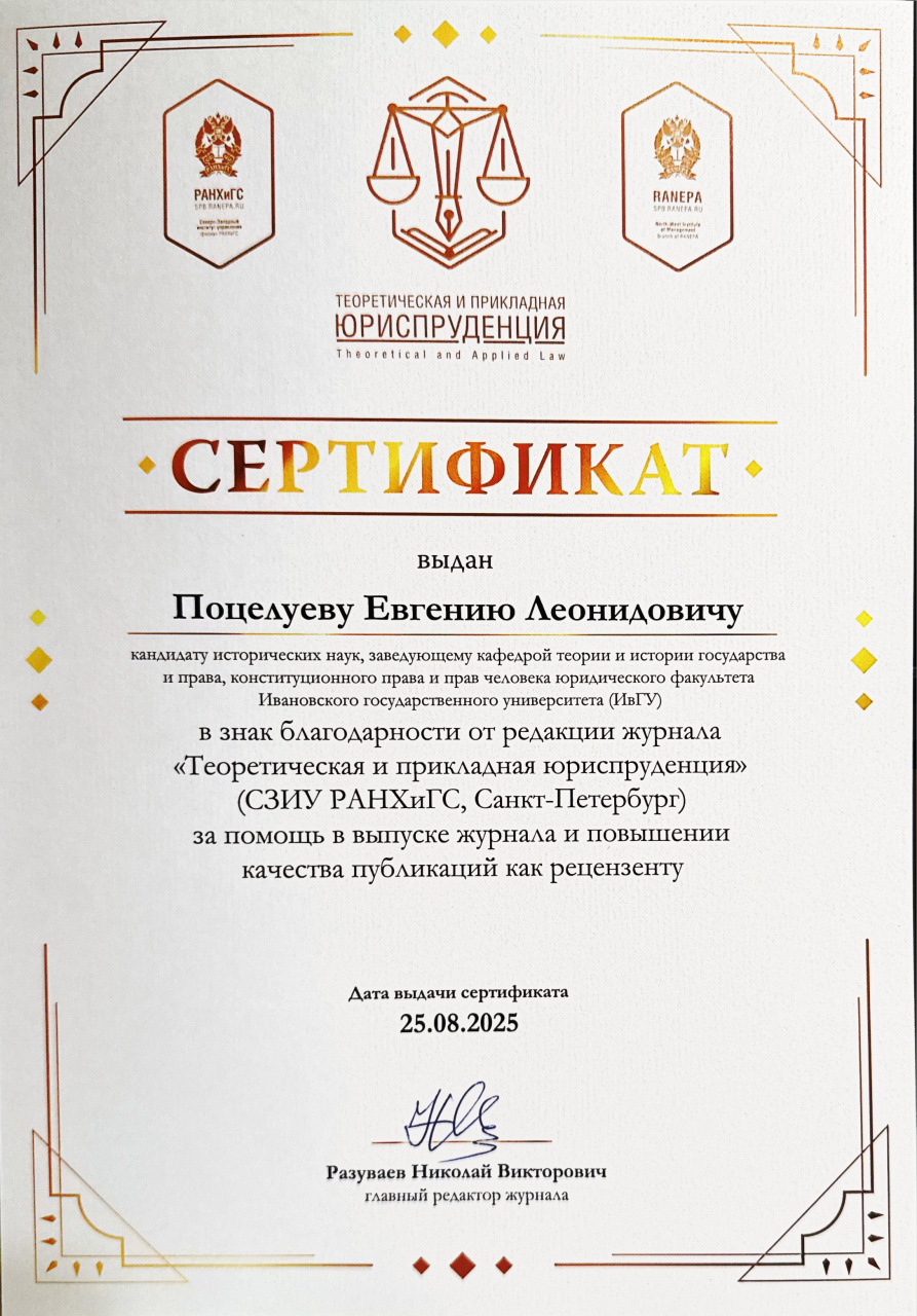 - Поцелуев Е.Л. «Четыре могилы современной философии права» : рефлексия на взгляды Бъярна Мелкевика // Теоретическая и прикладная юриспруденция. 2025. № 3 (25). С. 149-161. EDN: DWUPBX. ВАК (Категория К-2). «Белый список».