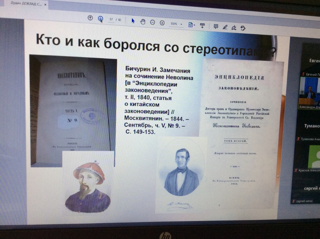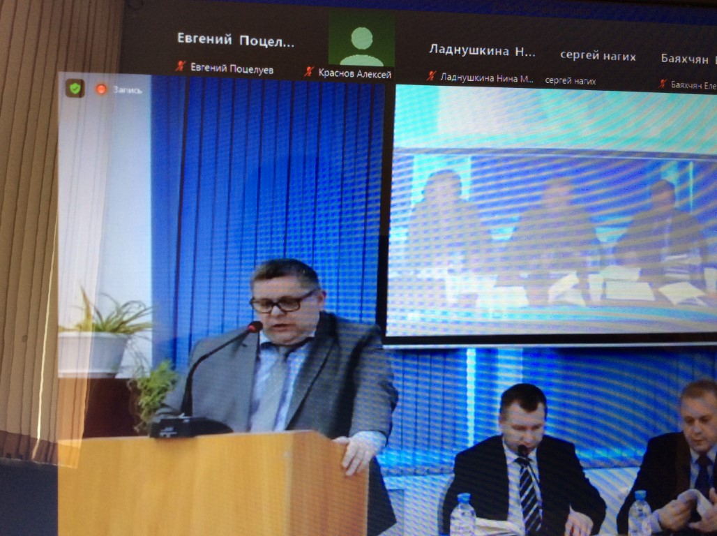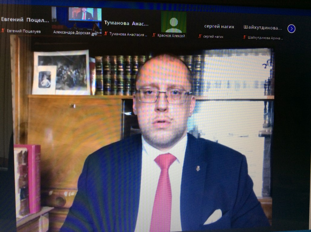 Доцент Е.Л. Поцелуев по видеосвязи принял участие во время дискуссии на пленарном заседании, показав специфику предмета научного направления учебной дисциплины «Сравнительное правоведение» по сравнению с «Историей государства и права зарубежных стран».