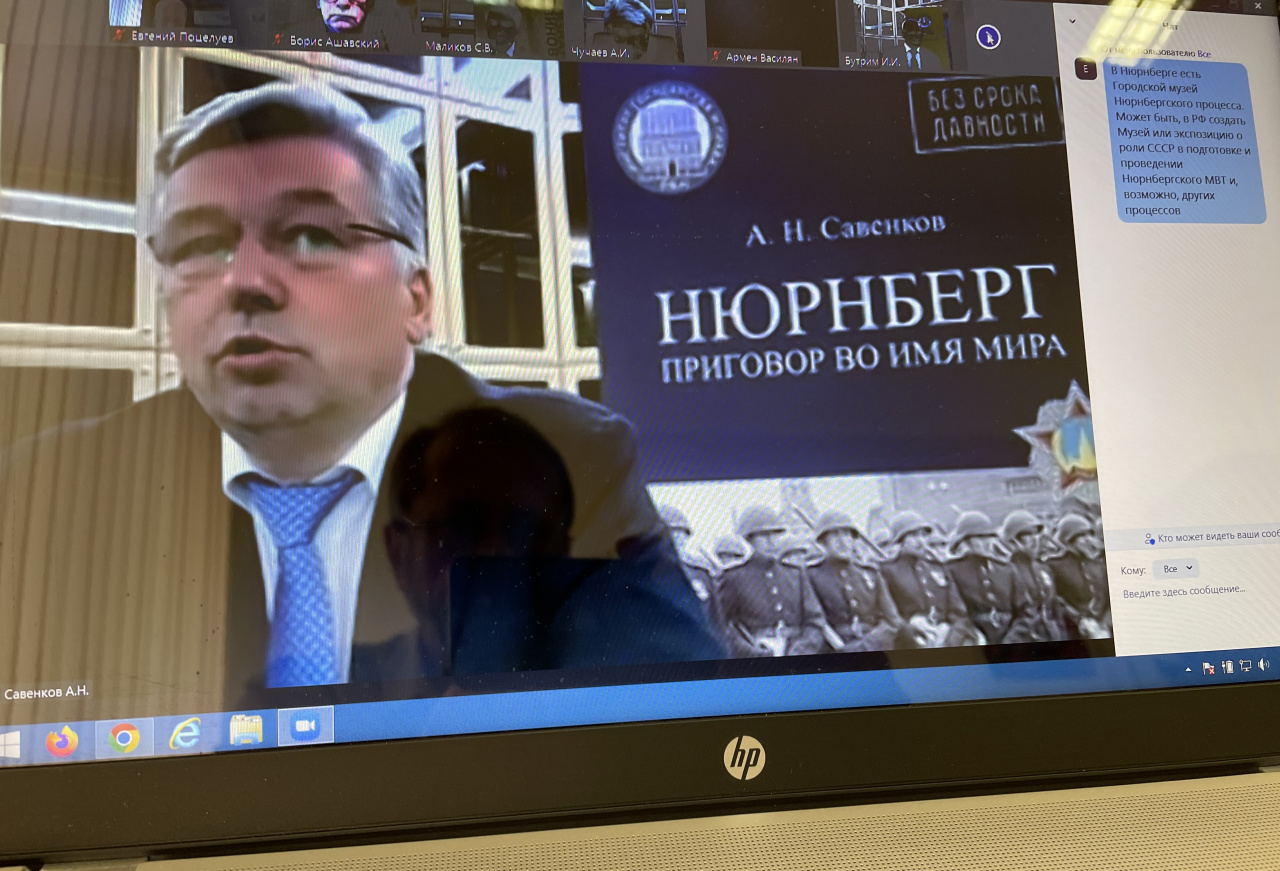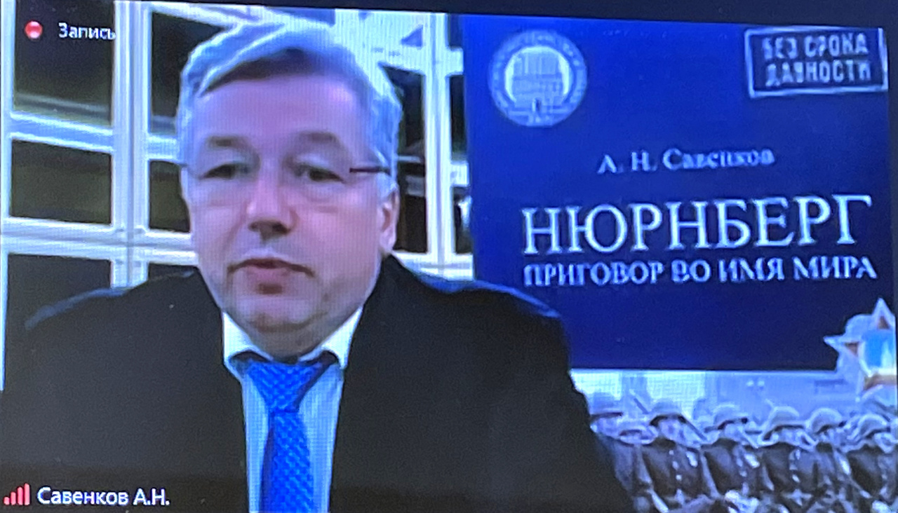 Среди слушателей вебинара было около 30 преподавателей российских вузов, в том числе первый проректор ИвГУ, заведующий кафедрой уголовного права и процесса, кандидат юридических наук, доцент О.В. Кузьмина и заведующий кафедрой теории и истории государства и права, кандидат исторических наук, доцент Е.Л. Поцелуев. Интерес этих ученых к вебинару, конечно, не был случайным. Во всех трибуналах применялись процедурные (процессуальные) нормы, правила доказывания, был состязательный процесс, формировался международный уголовный процесс, международное уголовно-процессуальное право. Научным руководителем О.В. Кузьминой по кандидатской диссертации был известный советский и российский ученый, доктор юридических наук, профессор, фронтовик, автор многих научных трудов Н.С. Алексеев (1914–1992), в том числе о Нюрнбергском трибунале. Е.Л. Поцелуев несколько лет преподавал на юридическом факультете по программе специалитета элективную дисциплину «Международное уголовное право», всегда востребованную студентами старших курсов; был участником семинара по Международному гуманитарному праву, проводимого МККК; участвовал в международном ДААД-семинаре по международному уголовному праву в Университете Пассау (грант ДААД), на котором выступил с докладом на немецком языке о международном терроризме; является автором многих научных статей по международному уголовному праву и глав в двух коллективных монографиях. Во время семинара в Пассау (ФРГ) для всех его участников была организована поездка в Нюрнберг, в Городской музей Нюрнбергского процесса, где была проведена многочасовая экскурсия. Во время вебинара Е.Л. Поцелуев задал вопрос: «Может быть, есть смысл создать музей или экспозицию о вкладе СССР, советских ученых, юристов в подготовку и проведение Нюрнбергского трибунала, а, возможно, и других подобных процессов?». Модератор вебинара предложил ответить на него А.Н. Савенкову, который дал обстоятельный ответ. В ИГП РАН есть Академия нюрнбергских принципов. В настоящее время в нашей стране действует более десяти передвижных выставок, посвященных Нюрнбергскому трибуналу. В Музее Победы есть зал на эту тему. А.Н. Савенков предложил в краеведческих музеях регионов отражать злодеяния немецко-фашистских захватчиков и японских милитаристов, что и делается в Псковской и Смоленской областях, Хабаровске, на Сахалине – и др.