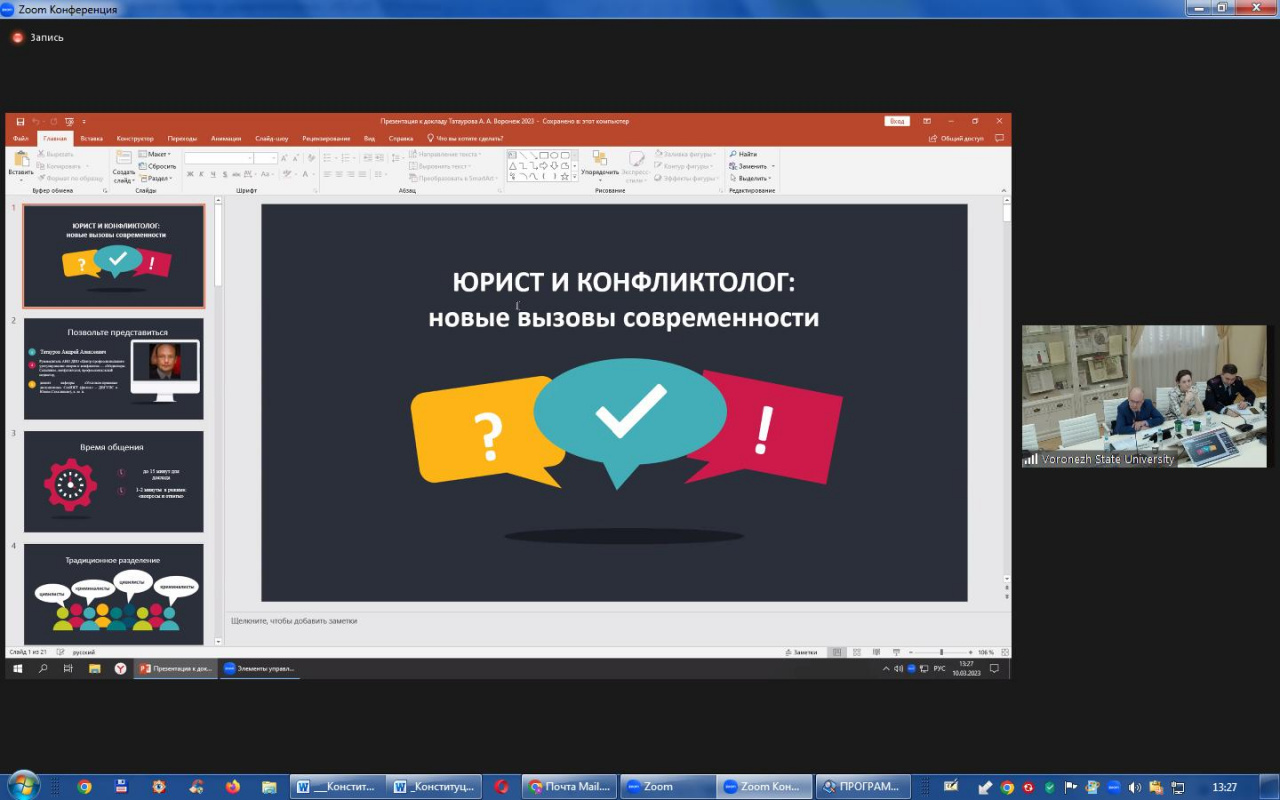 10 марта 2023 года кандидат юридических наук, доцент, первый проректор, заведующий кафедрой уголовного права и процесса ИвГУ О.В. Кузьмина и кандидат исторических наук, доцент, заведующий кафедрой теории и истории государства и права ИвГУ Е.Л. Поцелуев приняли участие во Второй международной научно-практической конференции «Юридические конфликты современного мира – 2023», организованной Научно-образовательным центром юридической антропологии и конфликтологии и кафедрой теории и истории государства и права юридического факультета Воронежского государственного университета (ВГУ).