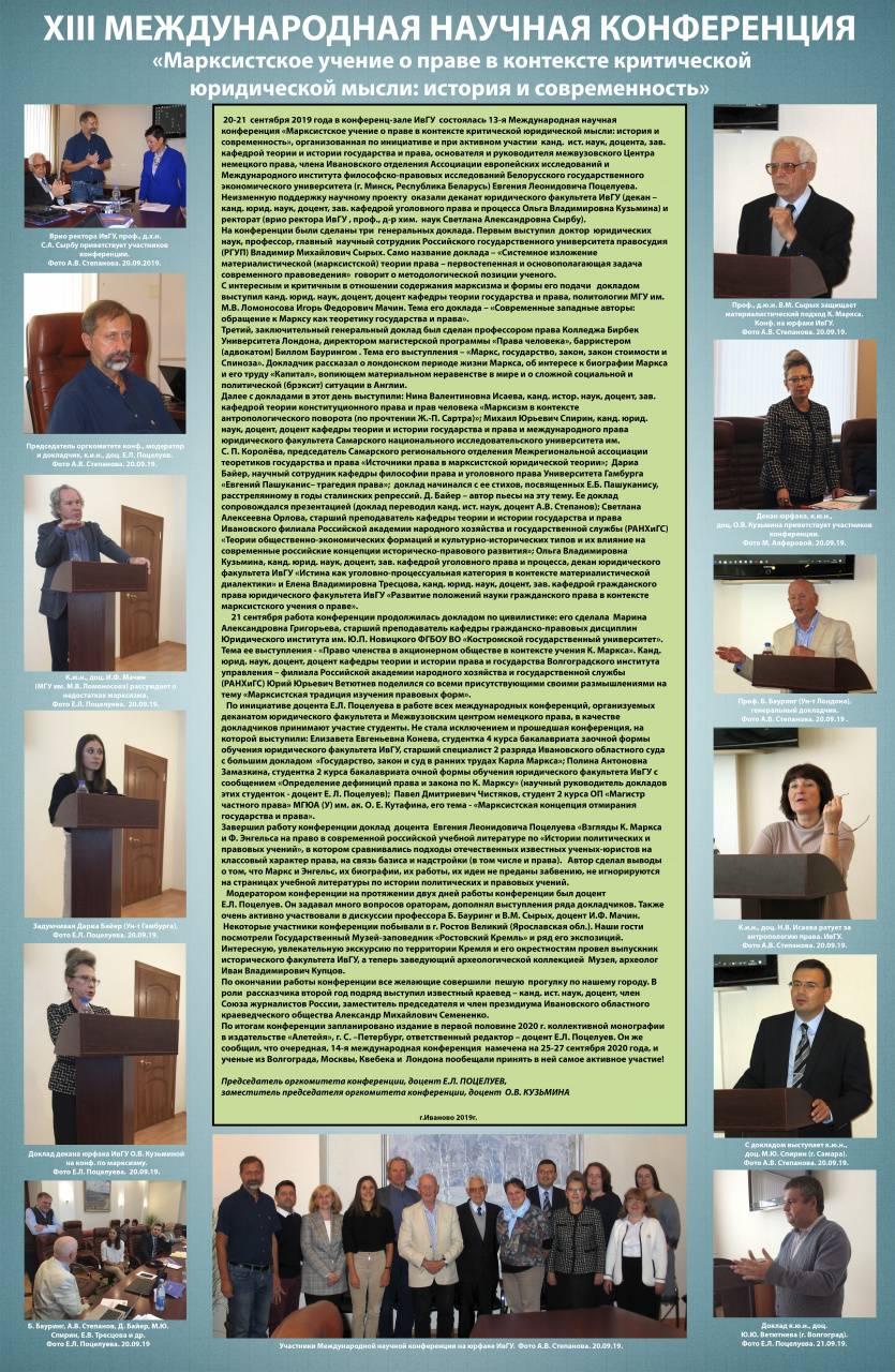 В продолжение уже сложившейся традиции по инициативе Е.Л. Поцелуева осуществлен выпуск фотогазеты, посвященной в данном случае 13-й Международной научной конференции «Марксистское учение о праве в контексте критической юридической мысли: история и современность». Как и ранее, фотоотчет о прошедшем мероприятии сделан по отобранным Е.Л. Поцелуевым и О.В. Кузьминой фотографиям и с авторским текстом. Техническая реализация фотогазеты стала возможной благодаря фирме «КонсультантПлюс» и конкретно их сотруднику Игорю Андреевичу Косульникову.