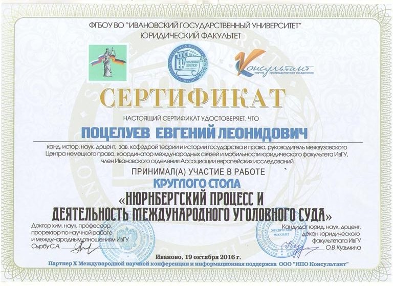 Во вступительном слове (по сути, в докладе «Международная уголовная юстиция: от международных военных трибуналов до Международного уголовного суда») председатель оргкомитета конференции и модератор круглого стола канд. ист. наук, доцент, зав. кафедрой теории и истории государства и права, руководитель межвузовского Центра немецкого права, координатор международных связей и мобильности юридического факультета ИвГУ, член Ивановского отделения Ассоциации европейских исследований Евгений Леонидович Поцелуев отметил, что современное международное право, в том числе и международное уголовное право, по мнению большинства отечественных и зарубежных специалистов в этой сфере, возникло после окончания Второй мировой войны: после принятия Устава ООН, создания этой универсальной организации, учреждения и работы Нюрнбергского и Токийского военных трибуналов (привлечения впервые в истории к уголовной ответственности лиц, виновных в совершении международных преступлений), международных пактов по правам человека 1966 г. и других международных документов. Он поделился своими впечатлениями от посещения Нюрнберга и Мемориала Нюрнбергского процесса во время участия в международном семинаре ДААД «Международное уголовное право в теории и на практике» в июне 2016 г., а также от посещения концлагеря Дахау недалеко от Мюнхена. Немцы помнят про трагические страницы своей истории, извлекли уроки и стараются не допустить возрождения расизма, национализма, шовинизма и т.п.