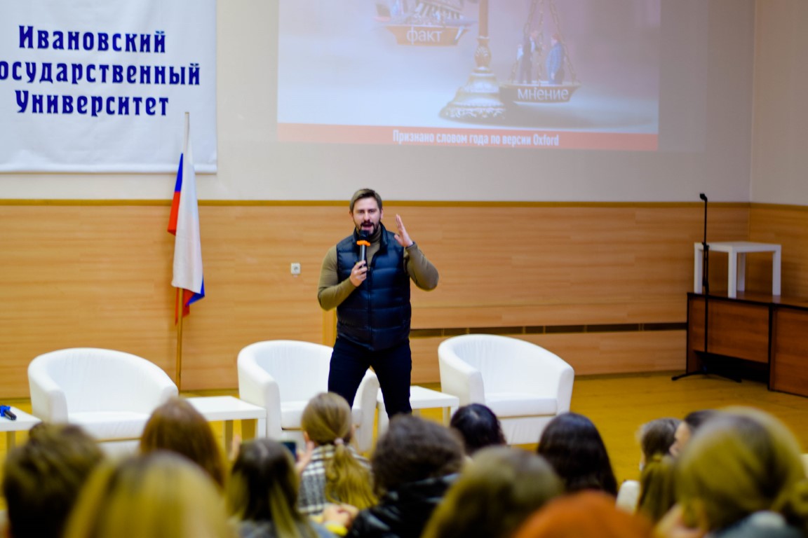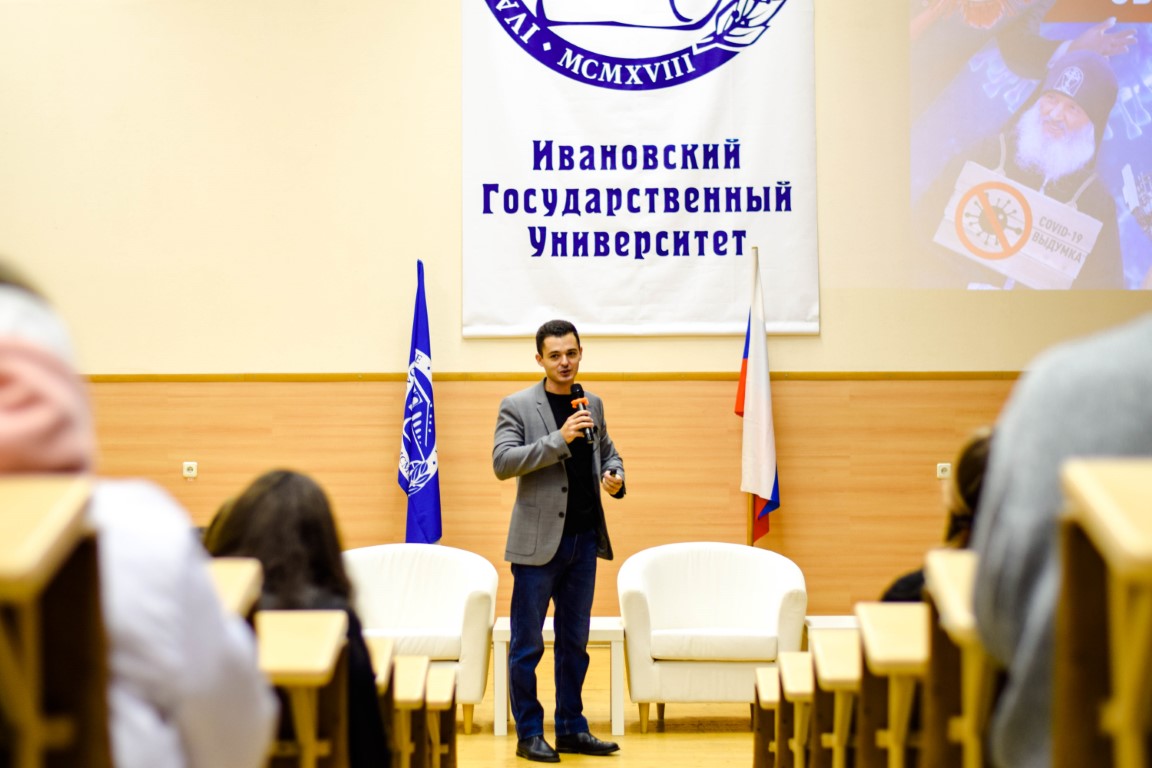 Павел Фельдман, обратившись к киноопыту аудитории, акцентировал значимое его расхождение с реальностью: скорее, не машина «очеловечилась», а человек в современном информационном обществе во многом стал уподобляться машине вследствие постоянного манипулирования и «программирования». Приводя яркие примеры «фейк-ньюс» о коронавирусе от «лидеров общественного мнения» (вплоть до знаменитого «чипирования»), спикер отметил, что «забавность» многих фейков кажущаяся – некоторые из них потенциально способны подорвать общественный порядок (как сфабрикованный украинским блогером подложный документ о введении в Москве военного положения). Массовое сознание склонно искать не рациональные аргументы, а «злобного врага», и П. Фельдман призвал аудиторию для начала задаваться простым вопросом: а является ли автор влиятельного мнения специалистом в своей области? Мы можем смеяться над тем, что Грета Тунберг занимает в рейтинге выдающихся ученых (по версии популярного журнала) высокое место, но ее активность в «левой» экологической повестке влияет на судьбу властных элит! Еще более выразителен пример с укоренившимся представлением об убийстве Иваном Грозным своего сына: хотя единственным и явно тенденциозным первоисточником является сообщение посланника римского папы после неудачной миссии в Москву, миф подхвачен и живет до сих пор. Приведя множество примеров, спикер выразил радикальный скепсис по поводу безоговорочного доверия абсолютно любому источнику информации, будь это «независимый» журналист, влиятельный блогер, учебник истории или эксперт из Москвы – только глубокий факт-чекинг способен приблизить нас к пониманию реальной ситуации, однако его проводят, по статистическим данным, около 2 процентов аудитории (данные следующего спикера).