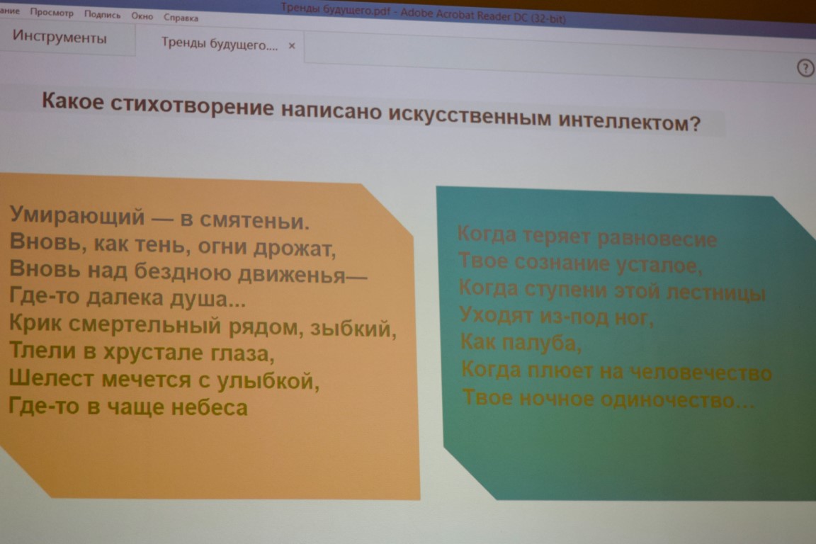 Кратко коснувшись перипетий своего профессионального пути и карьерного роста, С.С. Пелевина подчеркнула, что своим успехом в «Сбербанке» обязана огромной самоотдаче и жажде самореализации. Основной же темой встречи стала мини-лекция «Тренды будущего»: развернутая презентация с видеороликами, представившая быструю эволюцию «умных» технологий в последние десятилетия и последствия этой глобальной трансформации для рынка труда ближайших десятилетий. Вся информация – по соотношению возможностей человеческого мозга и ИИ, прогностике прорывных изобретений, зависимости капитализации крупнейших мировых компаний от их лидерства в области IT-технологий и т.п. – была удобно скомпонована и наглядно очерчивала современные тренды. Конечно, адаптация сложнейших вопросов для краткости и доходчивости всегда несет с собой потери. Так – возразим некоторым тезисам – существуют и (пока) непреодолимы принципиальные различия между человеческими когницией и деятельностью и сугубо «синтаксическим» ИИ, и никакие количественные успехи и даже «сетевое обучение» ситуацию не меняют; вряд ли стоит всерьез воспринимать прогнозы технического директора Google Рэя Курцвейла относительно близкого достижения бессмертия и восторг по поводу «суперумного» небиологического разума – скорее, стоит задуматься по поводу всё более ощутимой жажды влиятельных сил сделать всех нас функциональными одномерными «клеточками» в обществе тотального потребления. А «угадывание» присутствующих, где «стихотворение» ИИ, а где стихотворение Бродского, к сожалению, как раз и показало отсутствие у значительной части студенческой аудитории гуманитарной культуры.