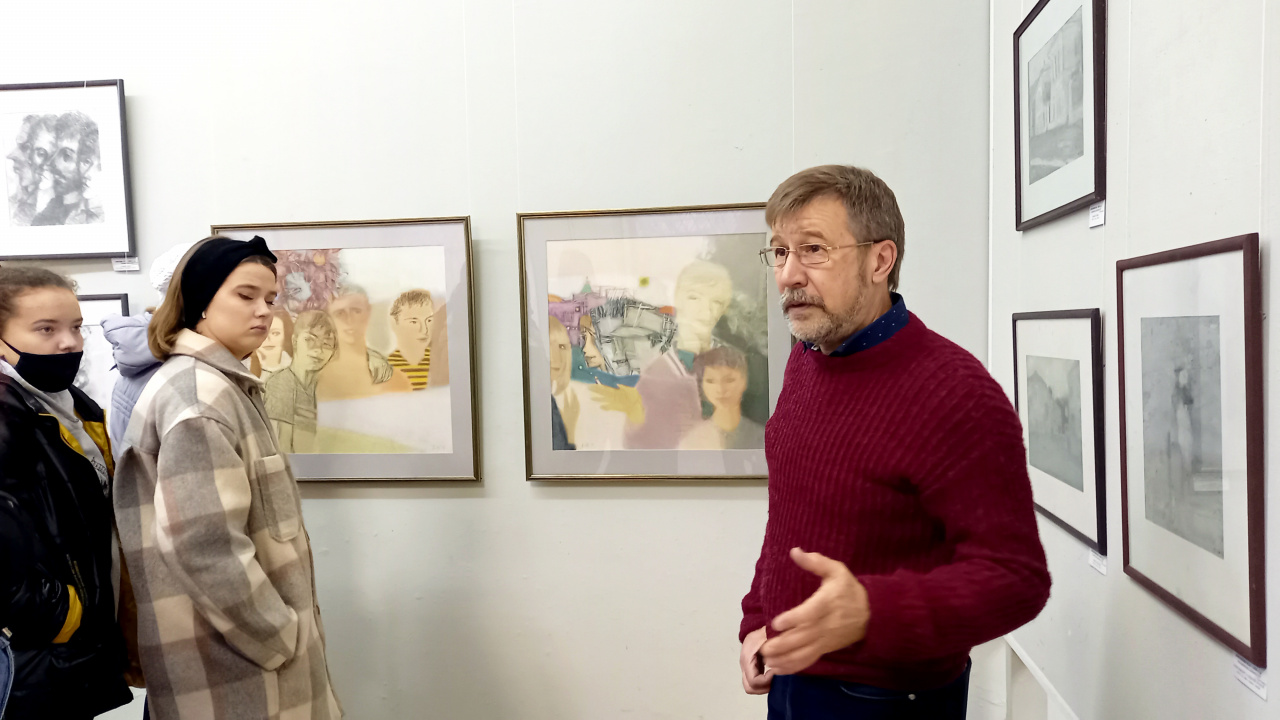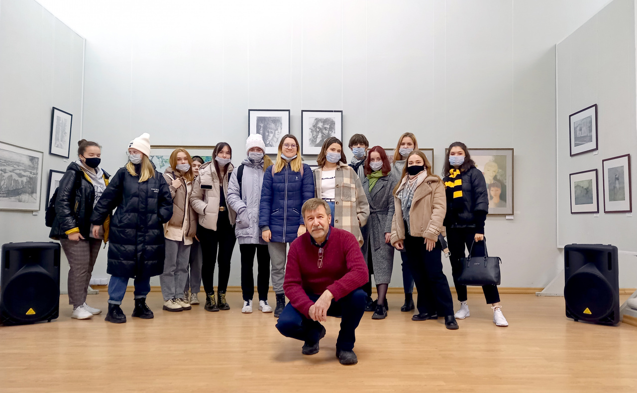 Экскурсию по выставке провел член Союза художников, Заслуженный художник Российской Федерации Александр Витальевич Климохин, чьи работы также на ней представлены. Студентам, изучающим основы композиции в рамках курса, посвященного фотографии, было интересно узнать о разнообразии графических техник, мастерстве выбора ракурса, о том, как художники работают с материалом, в том числе и с фотографическим. Учащиеся узнали, что художественное произведение – это синтетический текст, где смысловую нагрузку несет не только изображение, но и, к примеру, название, которое может полностью изменить ракурс восприятия картины.