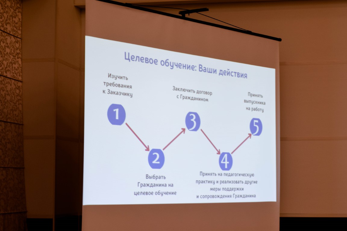 Затем ответственный секретарь приемной комиссии С.Г. Езерская сделала емкий и содержательный обзор актуальной проблематики целевого обучения, призванного улучшить кадровую ситуацию в школах и одновременно гарантировать выпускнику трудоустройство на уже знакомом месте, где его ждут. Она рассказала о возможностях и преимуществах целевой подготовки, имеющейся нормативно-правовой базе (две статьи Закона об образовании, определяющие круг заказчиков, Положение о целевом обучении, Распоряжение Правительства о целевых квотах на те или иные направления подготовки) и конкретных шагах по заключению договора с гражданином, его целевом сопровождении в процессе обучения и приеме на работу, обрисовала различные аспекты этого взаимовыгодного для всех сторон: вуза, студента, школы – сотрудничества. С.Г. Езерская сделала акцент на том, что целевое сопровождение возможно на самых различных этапах: школа может как направить своего выпускника для обучения по целевой квоте, так и поддерживать определенного студента бакалавриата или магистратуры (методически и др.), участвуя в его подготовке (например, через практики), чтобы он постепенно мог влиться в педагогический коллектив этой школы.