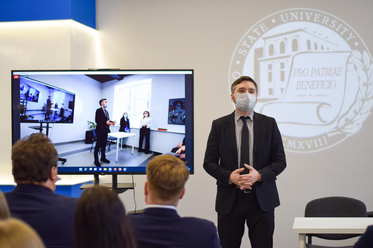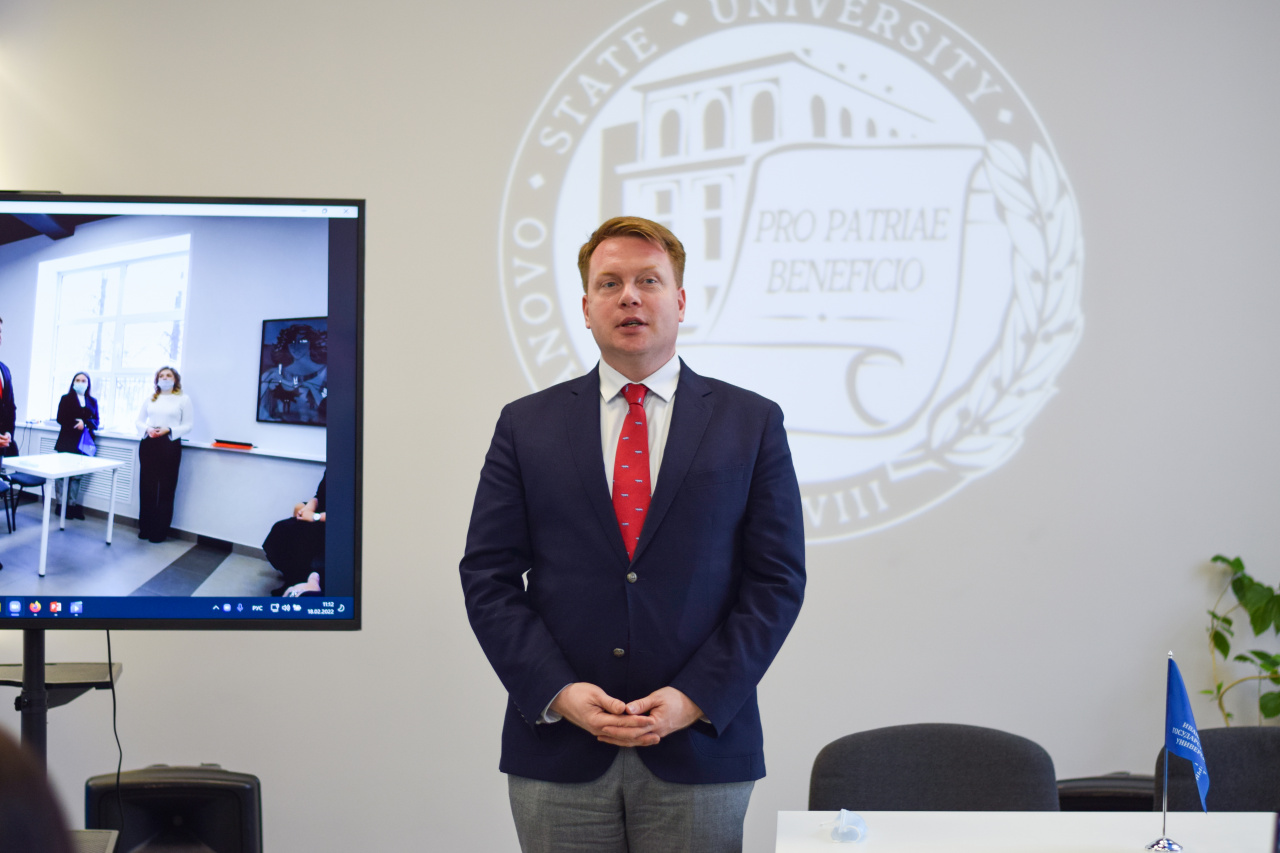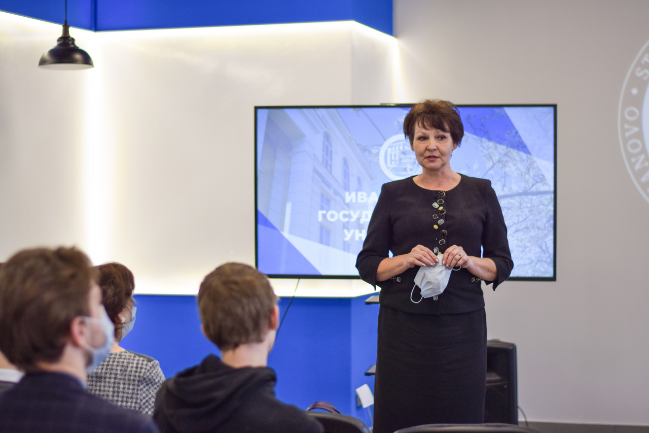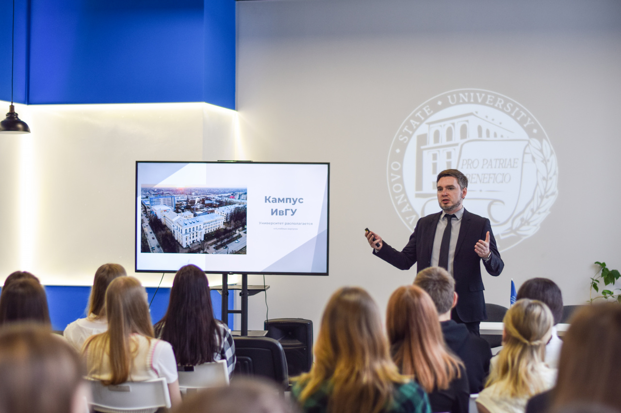 Затем проректор по социальному развитию и международной деятельности ИвГУ Н.Д. Сорокин рассказал школьникам о сильных педагогических традициях вуза, общежитиях, студенческой и международной жизни, проекте «Университетский лицей», портале «Гид абитуриента». В ИвГУ учатся студенты из более чем 40 стран мира, в том числе из Венесуэлы, Кипра, Боснии и Герцеговины. Студенты имеют возможности участвовать в программах международного обмена, получать дополнительную квалификацию без отрыва от учебы. Также Н.Д. Сорокин привел примеры успешных выпускников ИвГУ в разных сферах профессиональной деятельности и пригласил старшеклассников на День открытых дверей, который пройдет в ИвГУ 27 февраля.