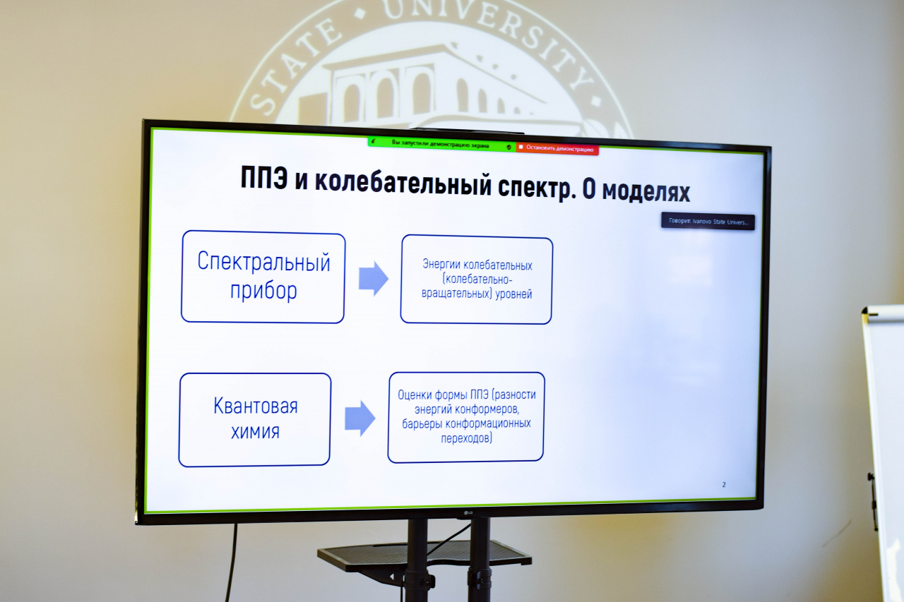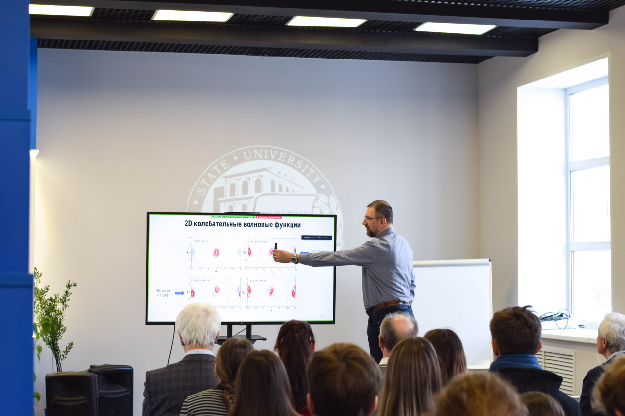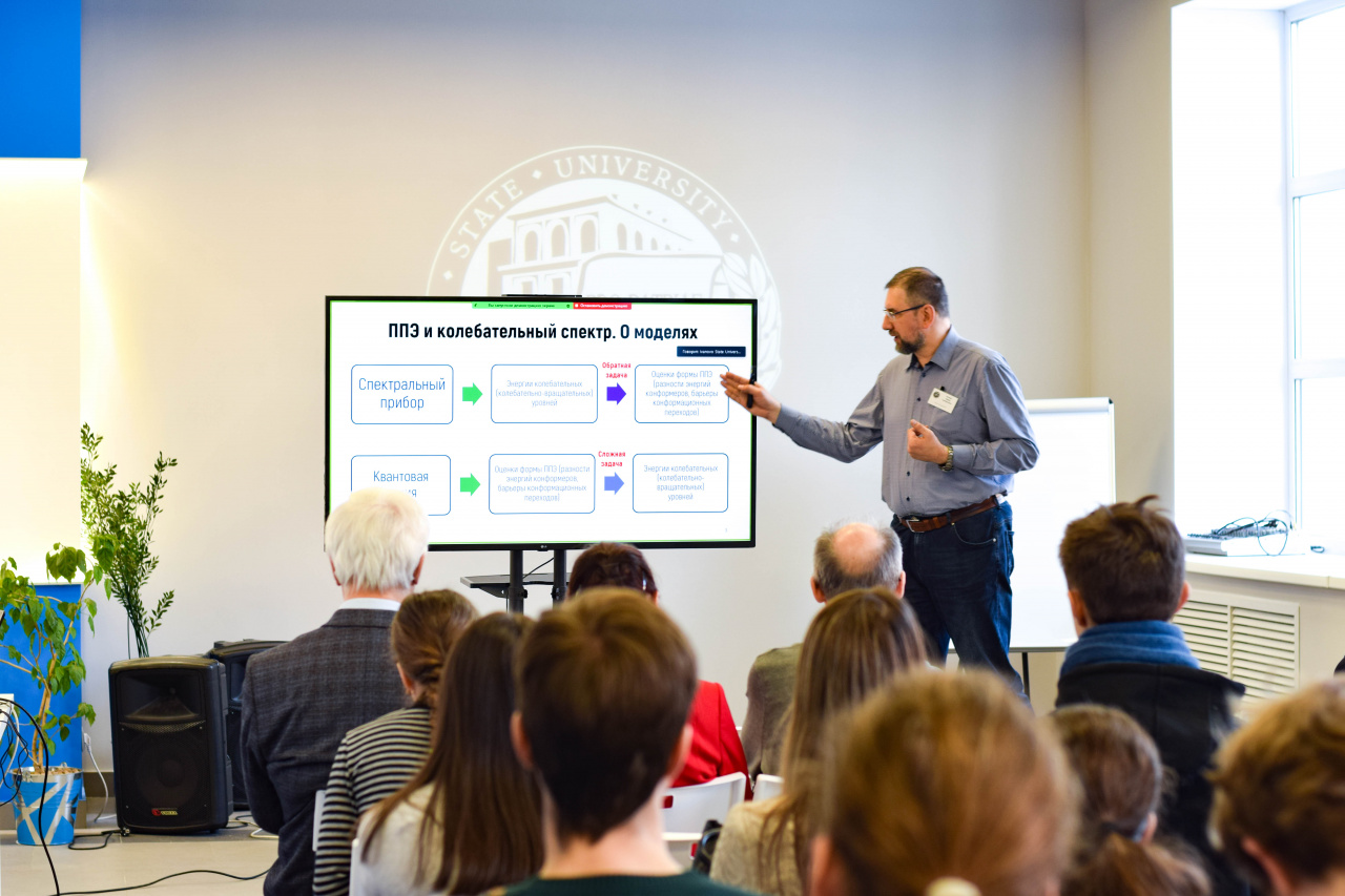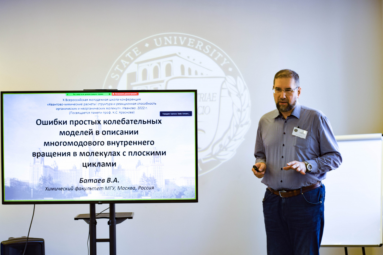 С приветствием к собравшимся обратились сопредседатель Организационного и Программного комитета школы-конференции, д-р хим. наук, профессор кафедры фундаментальной и прикладной химии Клюев М.В. и проректор по исследовательской и проектной деятельности ИвГУ Смирнова И.Н. А затем настала очередь пленарных докладов, первый из которых сделал канд. хим. наук, вед. науч. сотрудник лаборатории молекулярной спектроскопии (МГУ) Батаев В.А. («Ошибки простых колебательных моделей в описании многомодового внутреннего вращения в молекулах с плоскими циклами»).