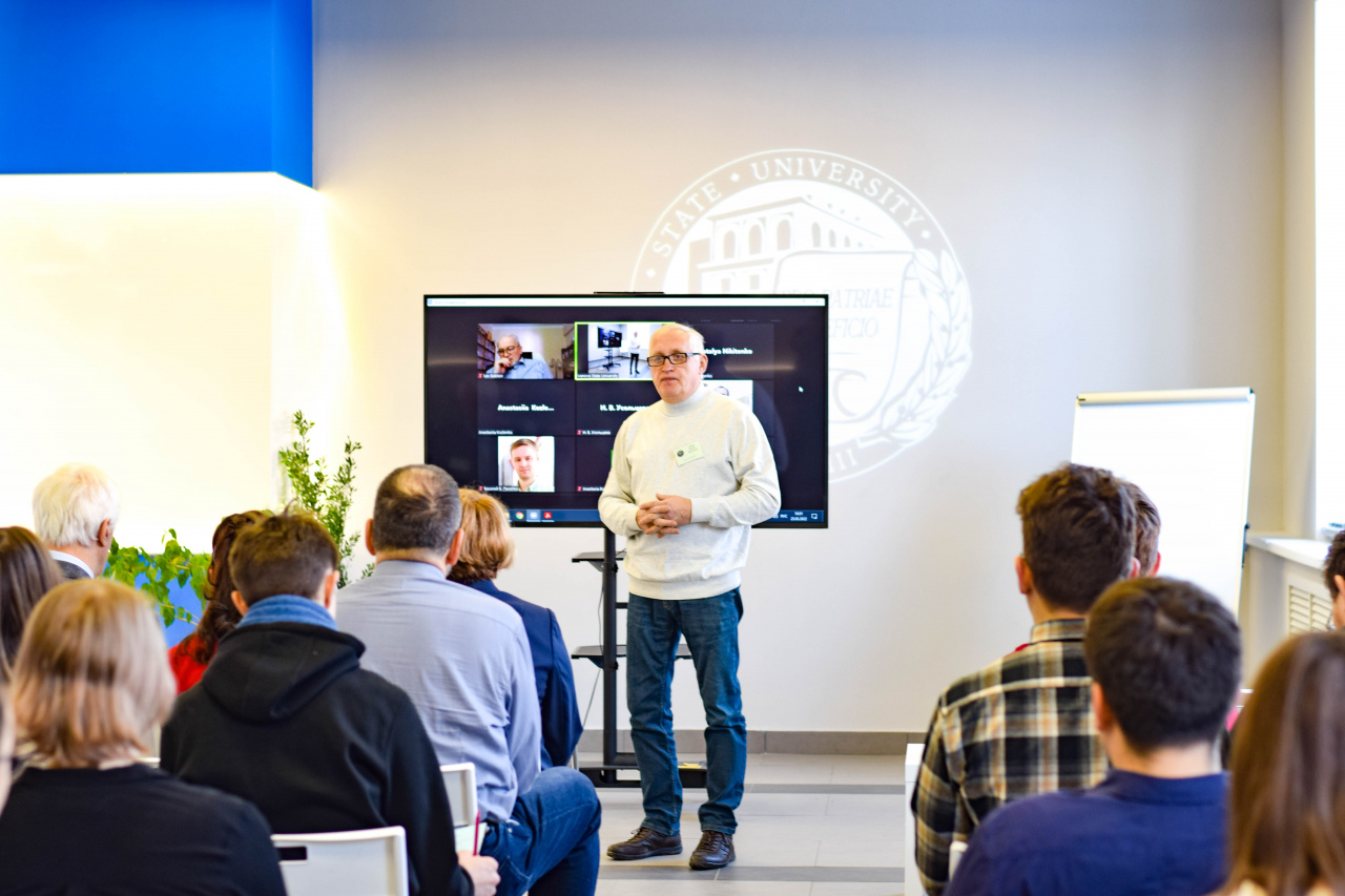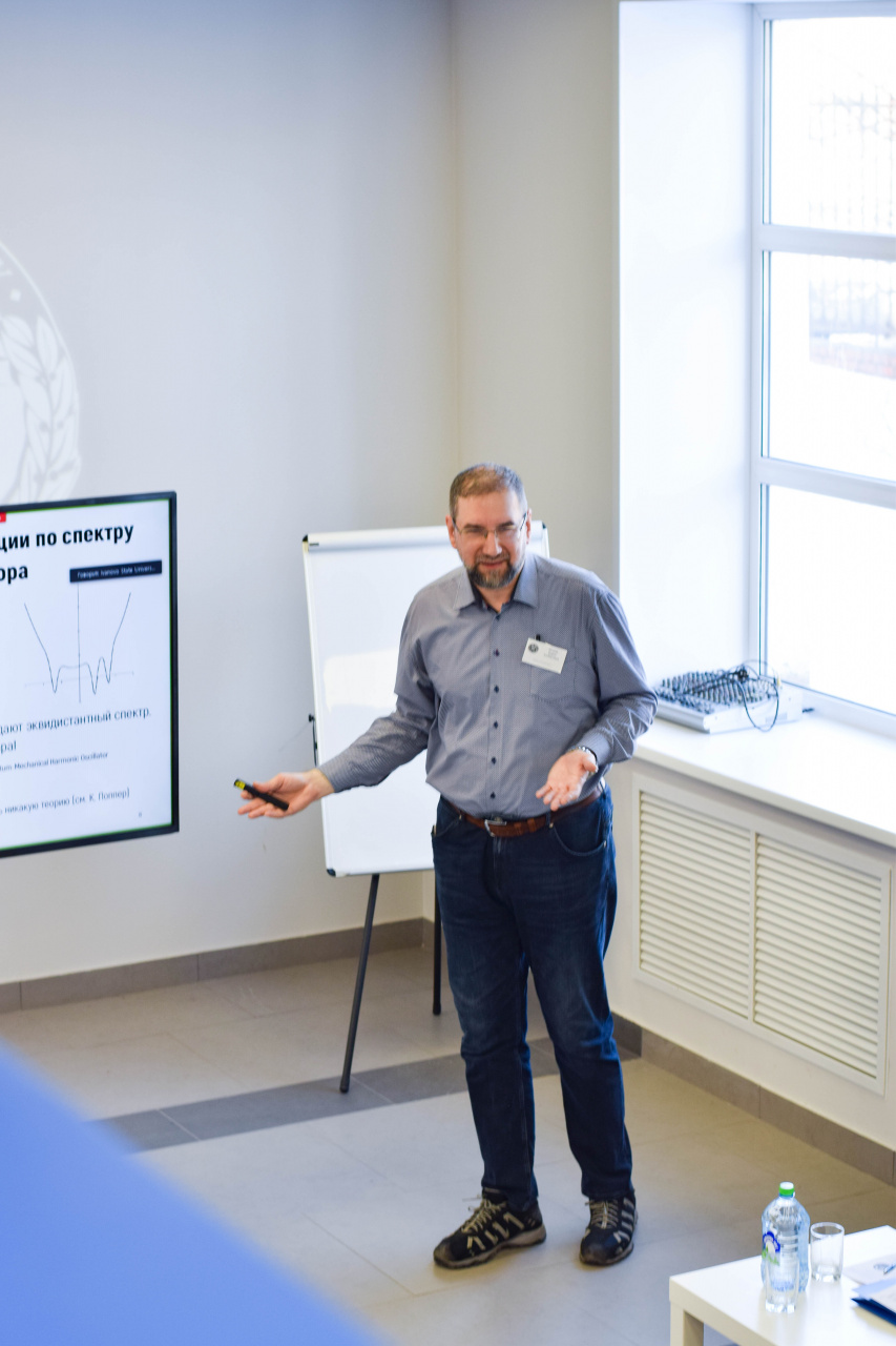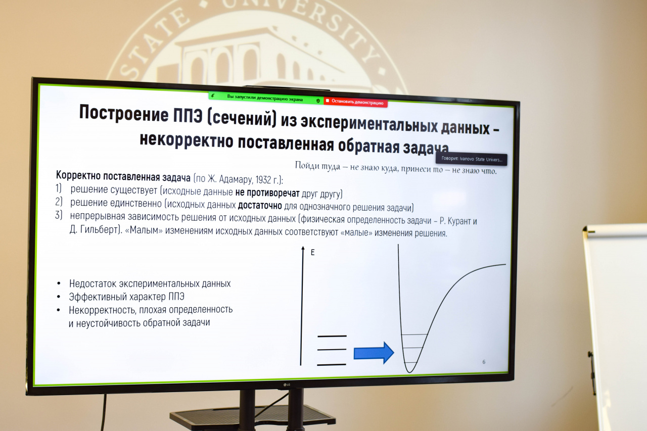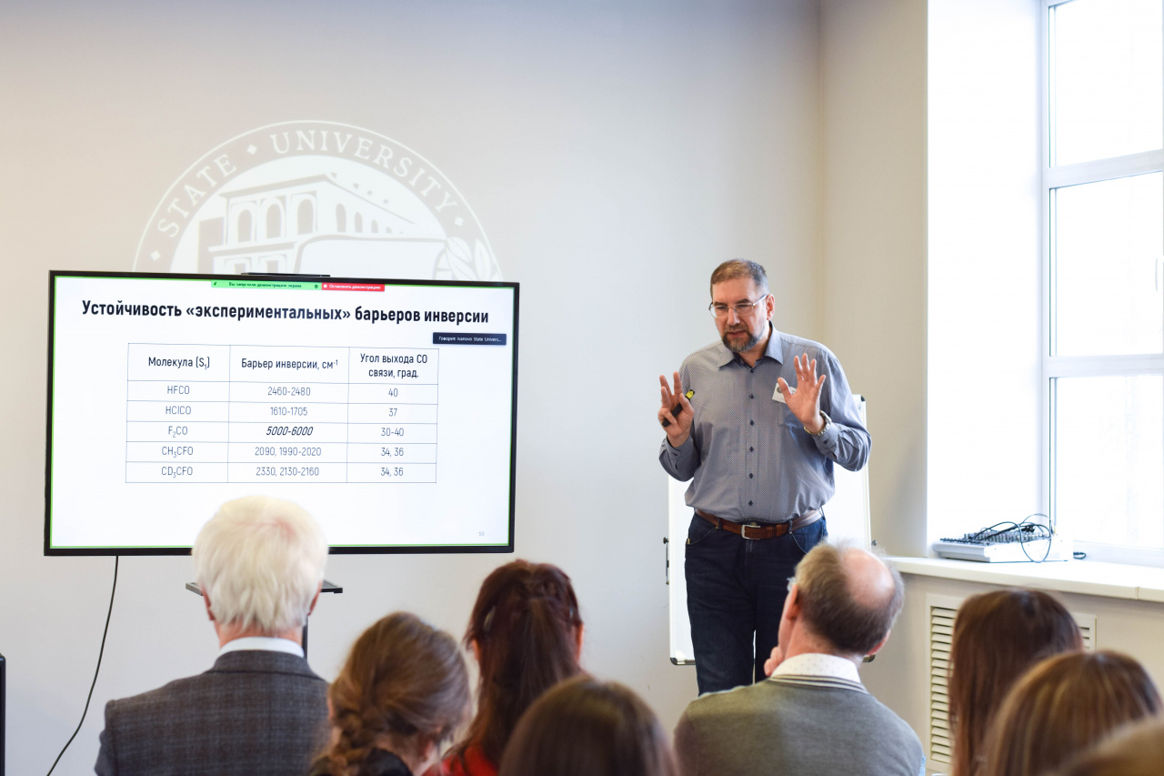 С приветствием к собравшимся обратились сопредседатель Организационного и Программного комитета школы-конференции, д-р хим. наук, профессор кафедры фундаментальной и прикладной химии Клюев М.В. и проректор по исследовательской и проектной деятельности ИвГУ Смирнова И.Н. А затем настала очередь пленарных докладов, первый из которых сделал канд. хим. наук, вед. науч. сотрудник лаборатории молекулярной спектроскопии (МГУ) Батаев В.А. («Ошибки простых колебательных моделей в описании многомодового внутреннего вращения в молекулах с плоскими циклами»).