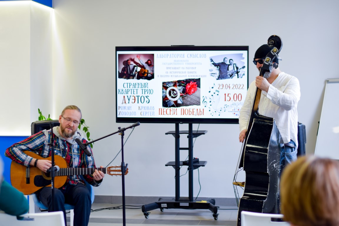 Тема исторической памяти и «песенно-музыкальная коммеморация» в осмыслении и проникновенном исполнении Романа Холодова и Сергея Крюкова (оба музыканта не нуждаются в представлении для любителей настоящей музыки) была совершенно свободна от каких бы то ни было бюрократизации и официоза – главной проблемы нынешнего патриотического воспитания, ибо говорили наши гости на языке «русского сердца», лучшей советской (и не только) музыки и глубокого понимания самой сути борьбы Добра и Зла в современном мире.