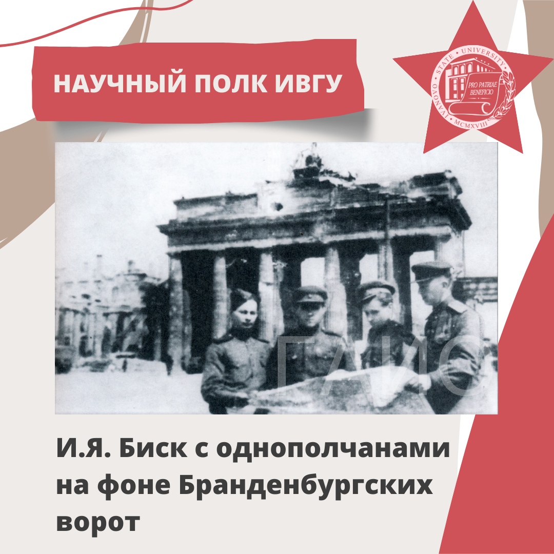 19-летний студент МИФЛИ Израиль Яковлевич Биск, как и многие его сверстники, сразу подал заявление об отправке добровольцем на фронт, хотя неизлечимая болезнь глаз позволяла остаться в тылу. В составе 3-й ударной армии И.Я. Биск дошел до Берлина. В память о тех годах в доме Бисков на видном месте всегда стояла фотография, на которой он с однополчанами запечатлен на фоне Бранденбургских ворот. О боевых заслугах говорят и награды: ордена Красной Звезды и Отечественной войны II степени, медали «За боевые заслуги», «За освобождение Варшавы», «За взятие Берлина» – и др.