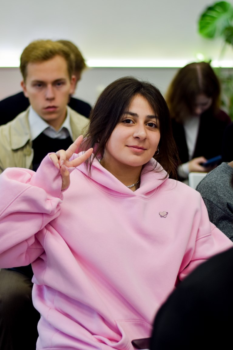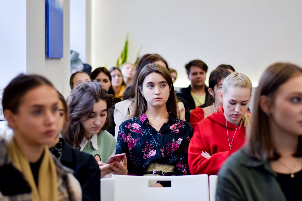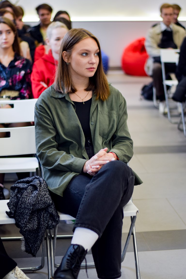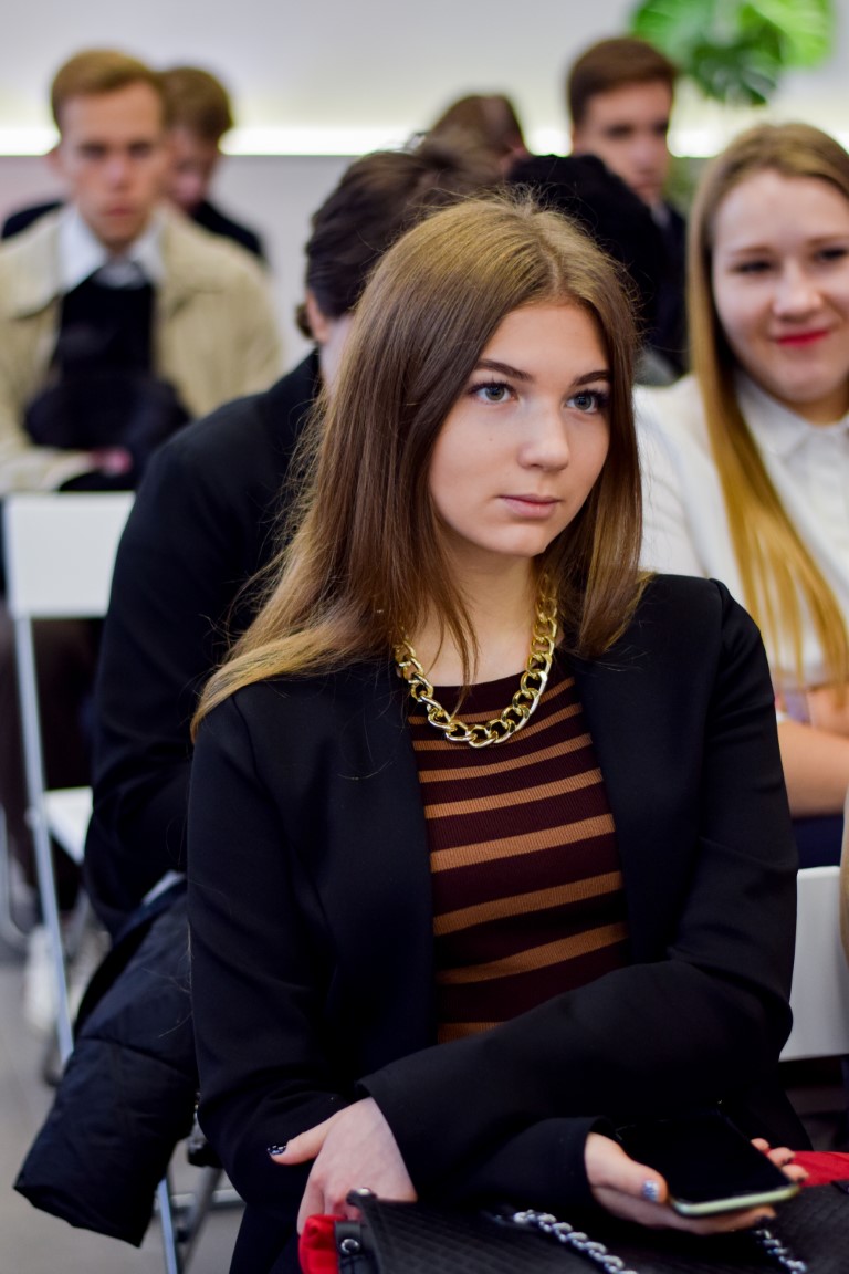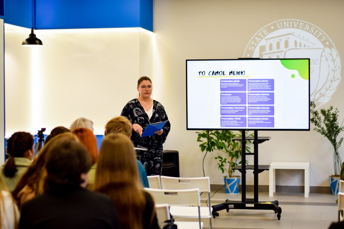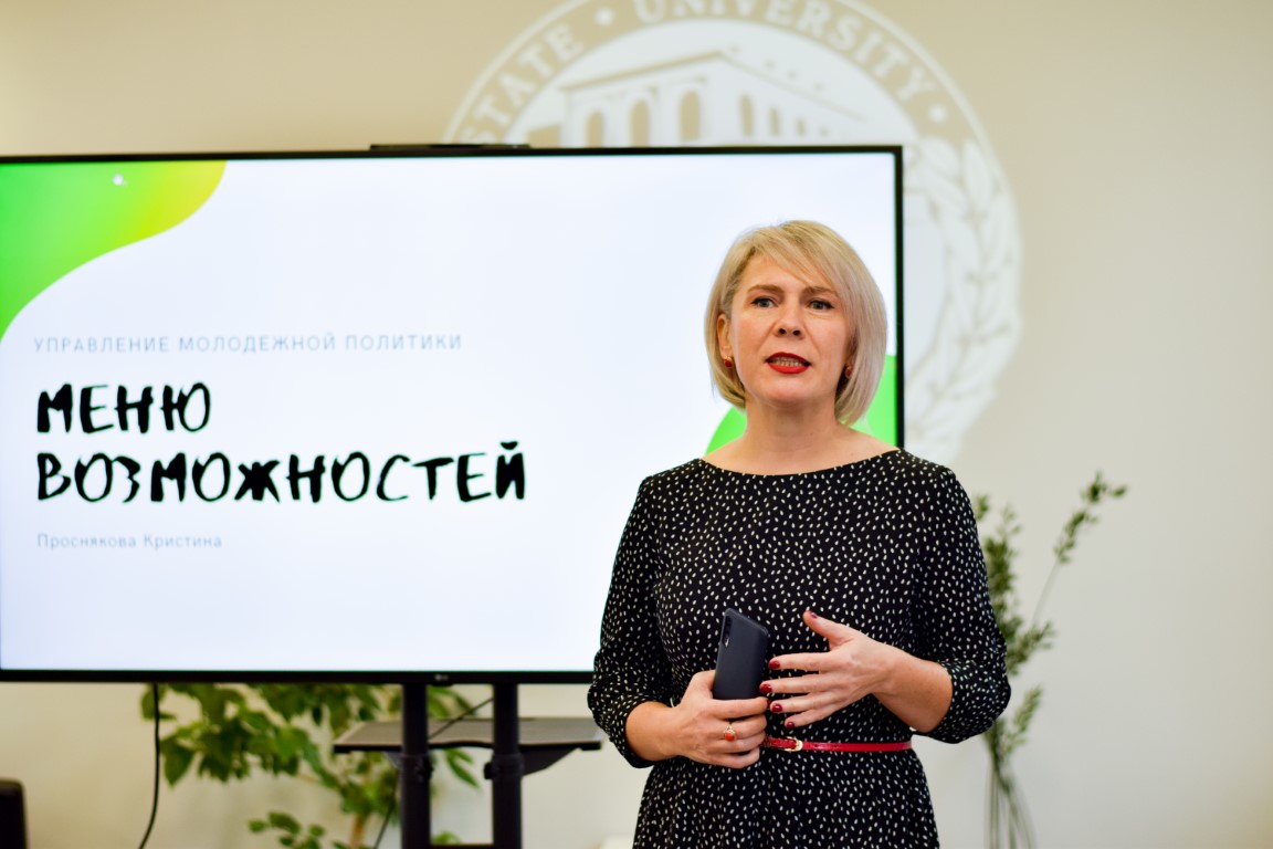 Кристина Проснякова презентовала для студенческой аудитории основные возможности, предлагаемые Федеральным агентством по делам молодежи, рассказала о грантовой системе Росмолодежи, о богатой географии и тематике молодежных форумов, поделилась личным опытом участия в волонтерской деятельности и организации мероприятий. Как отметила наша гостья, ее успехи (выигрыш миллионного гранта, приглашение в число организаторов масштабного форума и др.) – наглядное свидетельство того, какие перспективы открываются перед активными, инициативными и целеустремленными молодыми людьми. И действительно, эта тема близка аудитории: многие наши студенты также являются волонтерами.