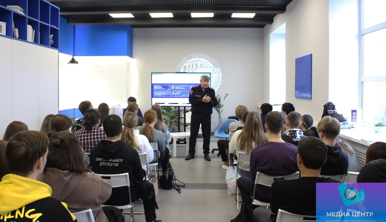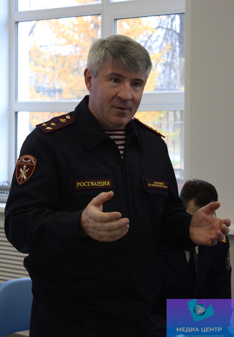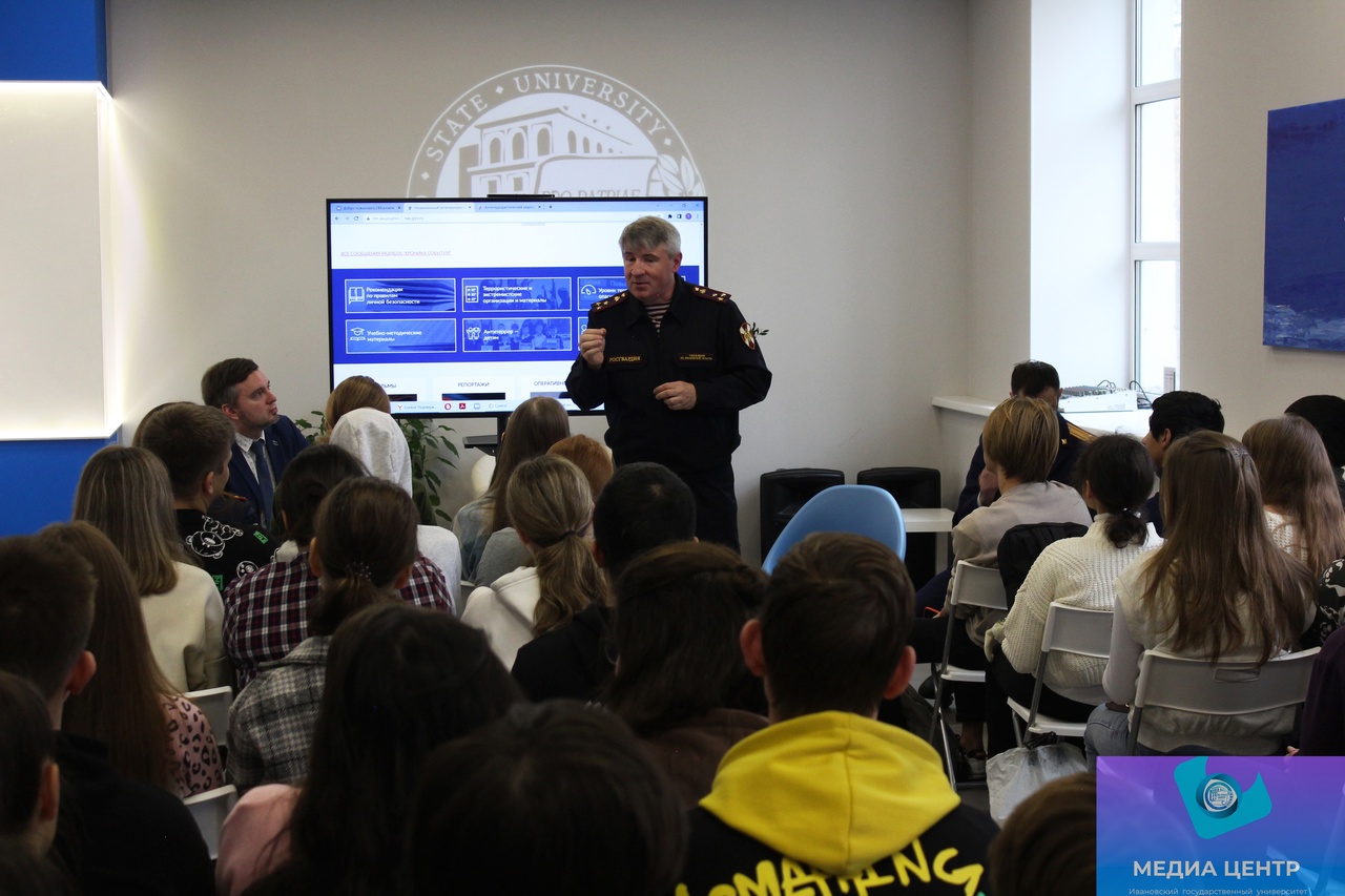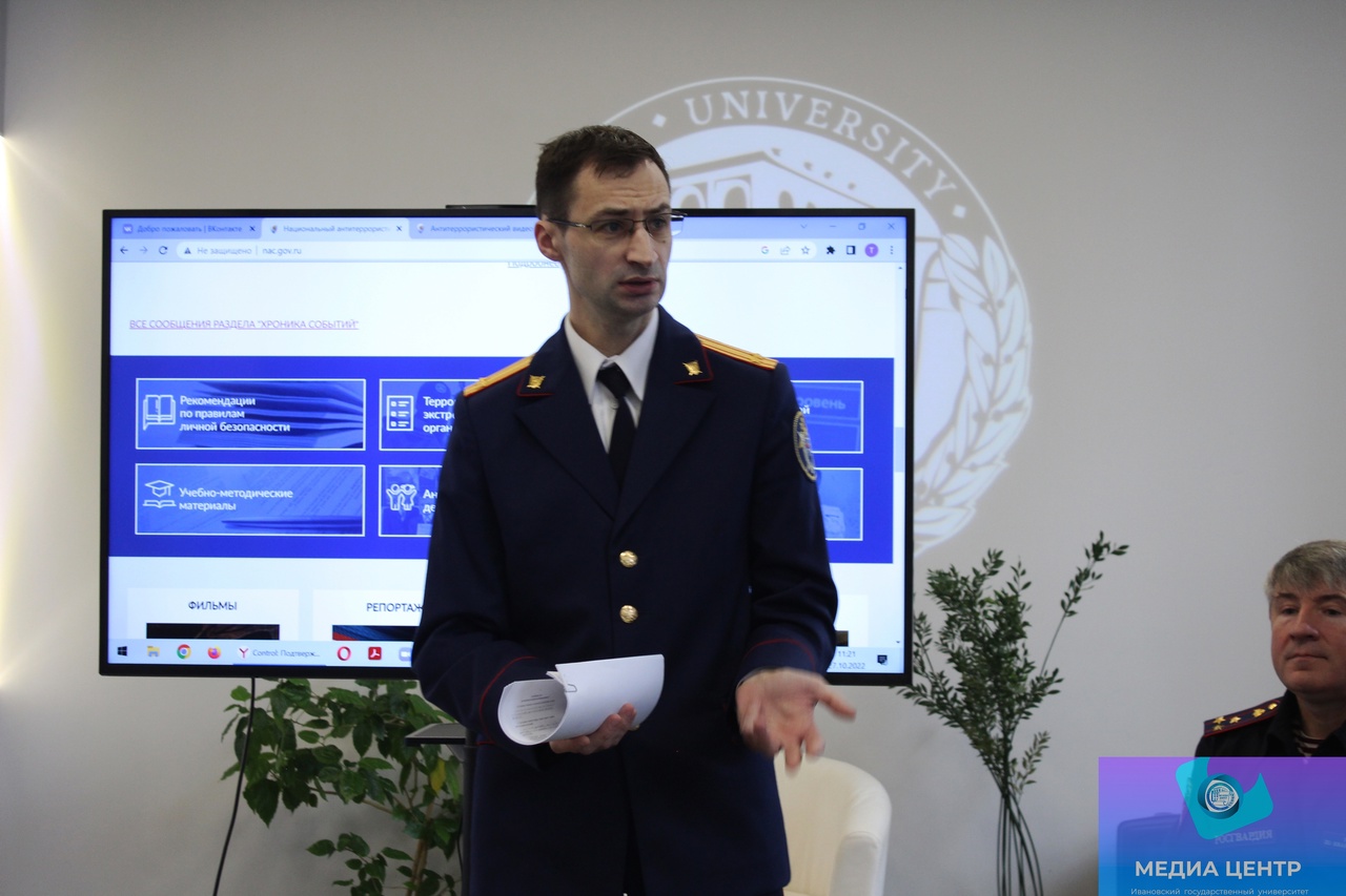 Первым из спикеров выступил помощник начальника Управления Росгвардии по Ивановской области по взаимодействию со СМИ, полковник полиции Роман Геннадьевич Панин. Он познакомил студентов с сайтом Национального антитеррористического комитета, на котором можно найти важную информацию и обучающие видеоролики.