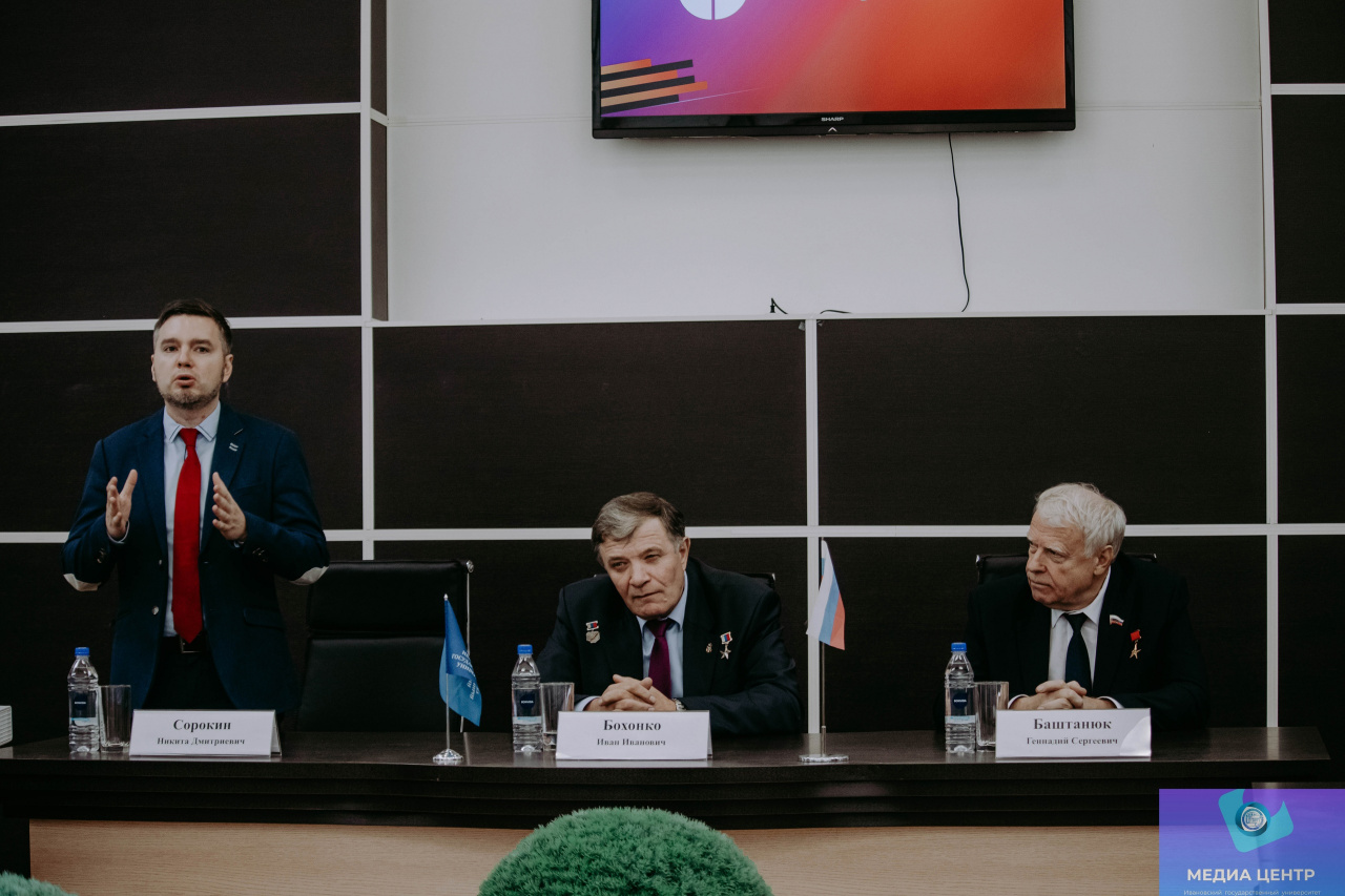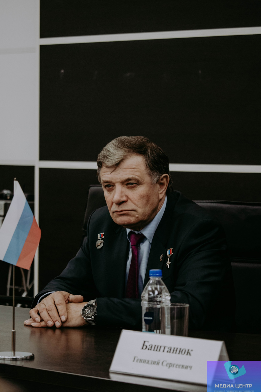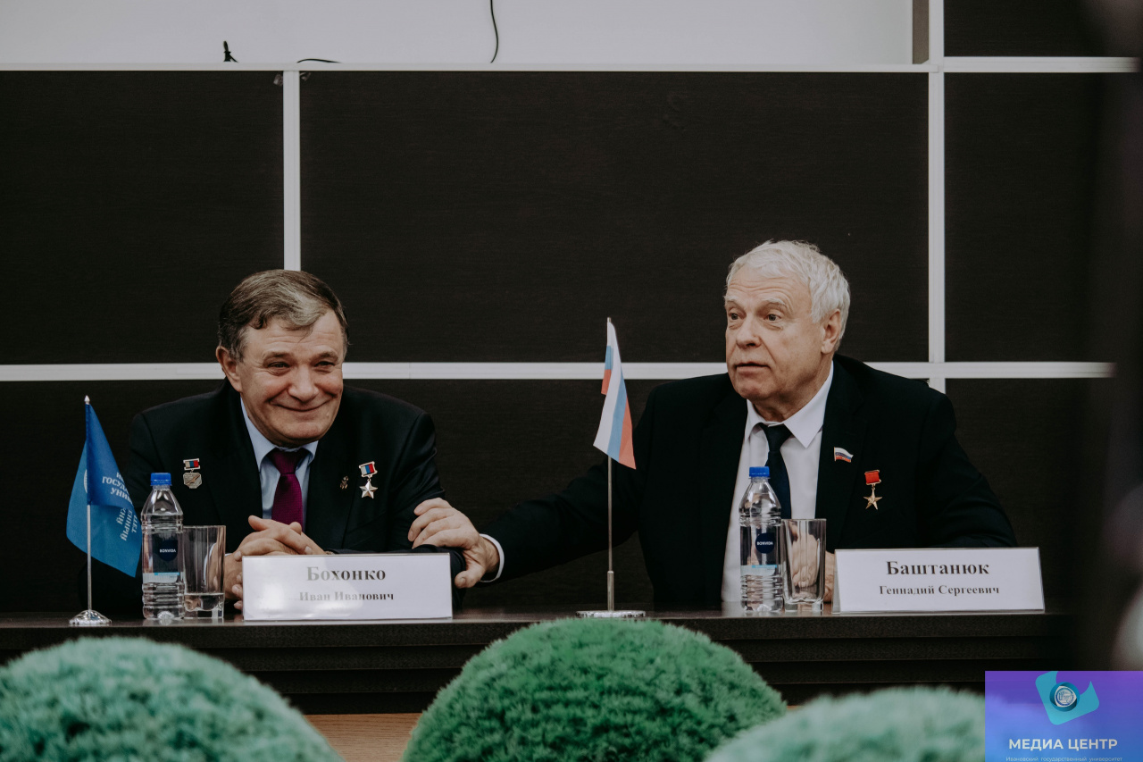 2 ноября в конференц-зале 6-го учебного корпуса ИвГУ в рамках проекта «Диалог с героем» состоялась встреча с людьми, отмеченными высшей наградой государства – Звездой Героя. Перед собравшимися выступили Герой Социалистического труда Геннадий Сергеевич Баштанюк и Герой Российской Федерации генерал-лейтенант Иван Иванович Бохонко.
