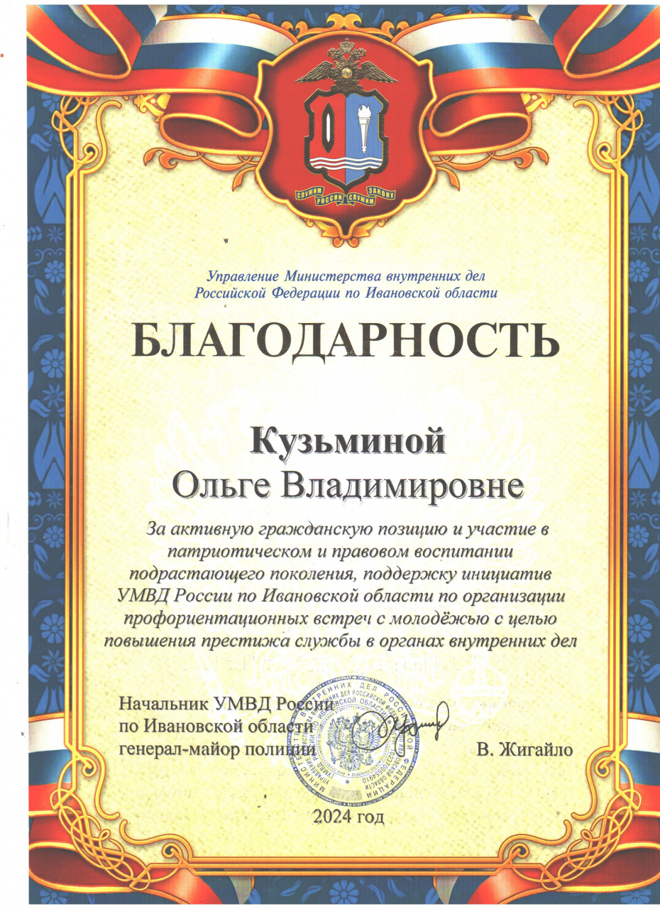 По результатам работы в 2023 и первом квартале 2024 гг. начальник УМВД региона генерал-майор полиции В.Н. Жигайло вручил наиболее активным общественникам Благодарности со словами признательности за участие в работе Общественного совета. Среди награжденных и О.В. Кузьмина. Она получила Благодарность за активную гражданскую позицию и участие в патриотическом и правовом воспитании подрастающего поколения, поддержку инициатив УМВД России по Ивановской области по организации профориентационных встреч с молодежью с целью повышения престижа службы в органах внутренних дел.