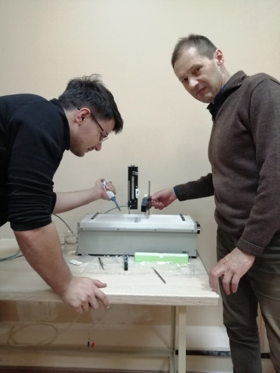 В НИИ наноматериалов поступило новое оборудование — ванна Ленгмюра, производства ООО «Машремторг» (г. Гомель). Она предназначена для нанесения тонких пленок на твердые подложки и проведения фундаментальных научных исследований в области молекулярной электроники, изучения структуры и свойств аналогов биологических мембран, сенсорики и др. Представитель предприятия-изготовителя А.А. Суслов произвел наладку оборудования и обучение сотрудников НИИН в.н.с. к.ф.- м.н. Смирнову А.И., м.н.с. НИИН и асп. ИХР РАН Никитина К.С. работе на установке.