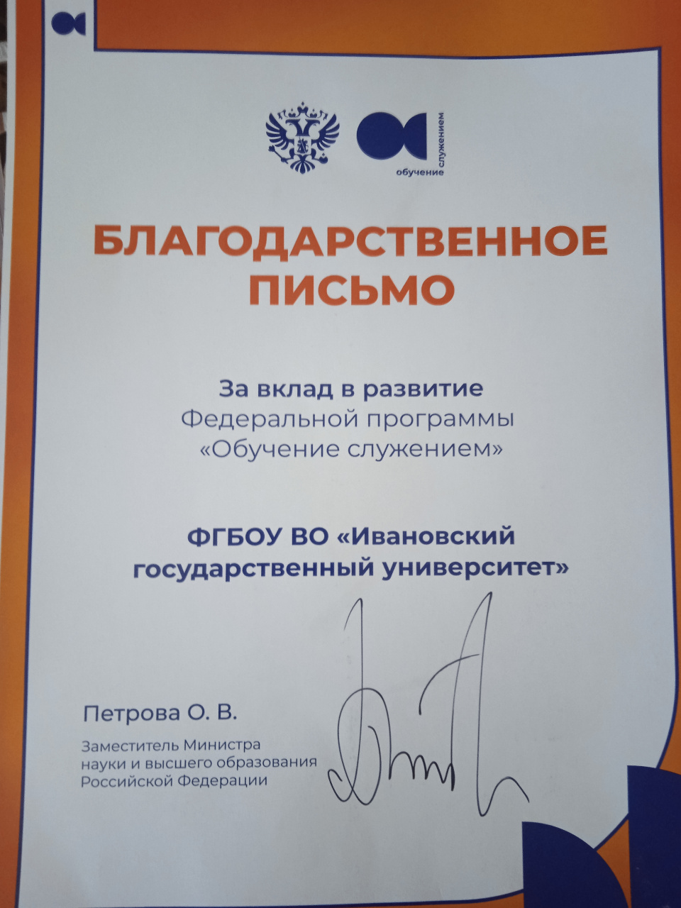 Заместитель министра науки и высшего образования РФ О.В. Петрова вручила ИвГУ благодарственное письмо за вклад университета в развитие Федеральной программы «Обучение служением».