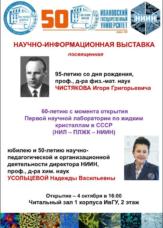 В читальном зале Ивановского государственного университета организована Научно-информационная выставка, посвященная 95-летию со дня рождения, проф., д-ра физ.-мат. наук Чистякова Игоря Григорьевича, 60-летию с момента открытия Первой научной лаборатории по жидким кристаллам в СССР, юбилею и 50-летию научно-педагогической и организационной деятельности директора НИИН, проф., д-ра хим. наук Усольцевой Надежды Васильевны.