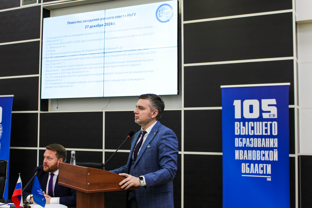 27 декабря состоялось последнее в уходящем календарном году заседание ученого совета Ивановского государственного университета. На заседании, которое прошло в расширенном формате с участием заведующих кафедрами и молодых преподавателей, ректор ИвГУ Алексей Малыгин подвел итоги уходящего года, рассказав членам совета и гостям о тех проектах, которые были реализованы в 2024 году.