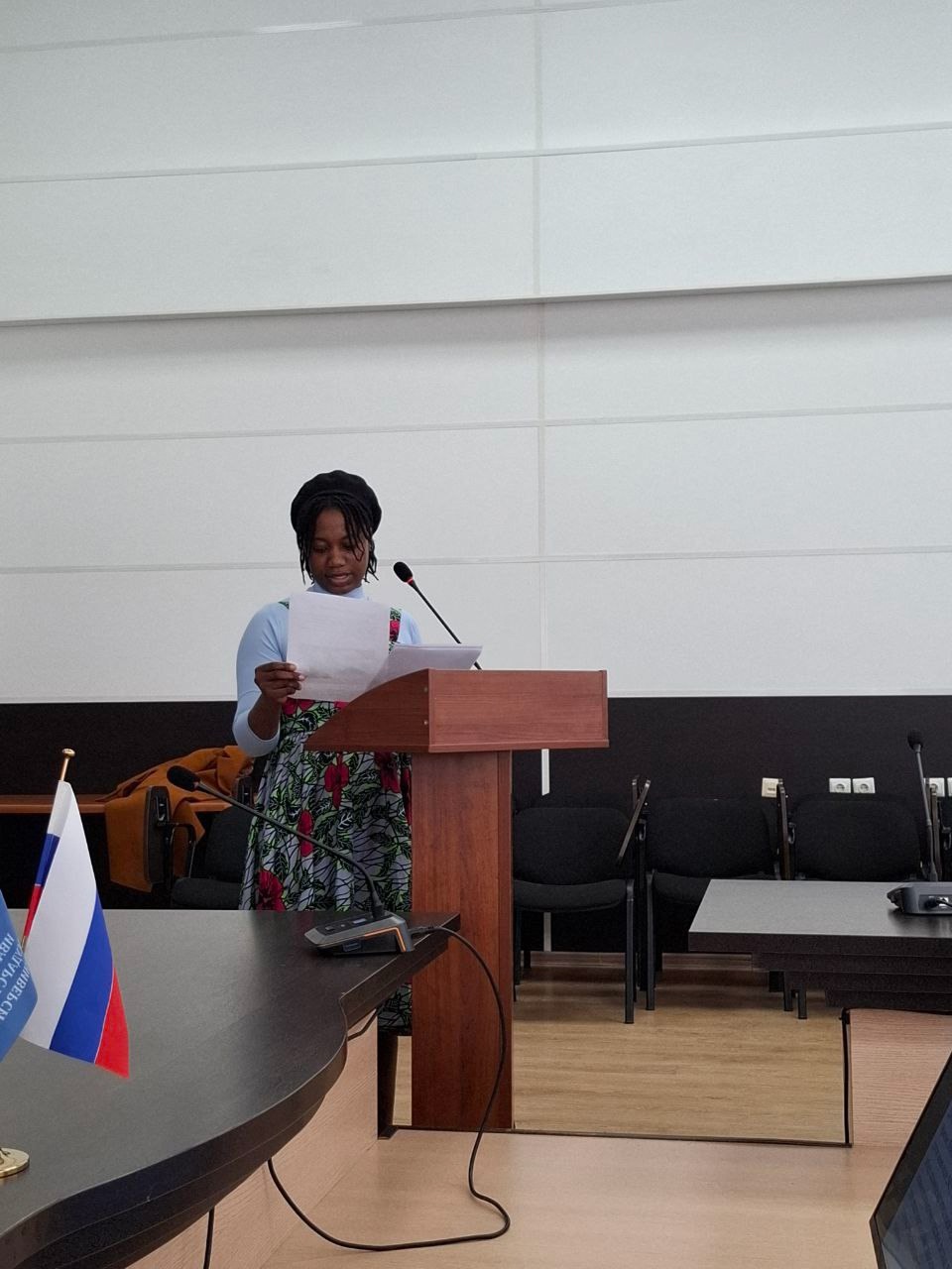 Завершилось мероприятие африканским голосом памяти. О роли народов Африки в борьбе с фашизмом и колониализмом, участии африканцев в движении против колониальных и фашистских режимов рассказали Леа Фаньоннузон из Бенина, Джиби Ндиай из Сенегала (подгот. отделение, гуманит. направление), Пол Керэн Хендо из Конго, Фернанду Азелиу Хосе из Анголы (ИСЭН, 1-й курс, «Менеджмент»), Тила Дарлин Фуэжио из Камеруна (ИСЭН, 1-й курс, «Финансы и кредит»).