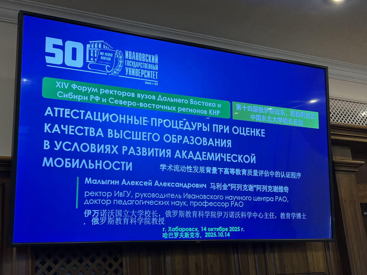 14-15 октября ректор ИвГУ Алексей Малыгин и проректор Никита Сорокин приняли участие в XIV Форуме ректоров вузов Российской Федерации и Китайской Народной Республики, проходившем в г.Хабаровске. Темой совещания стала «Роль университетов России и Китая в обеспечении стратегического лидерства стран-партнеров».