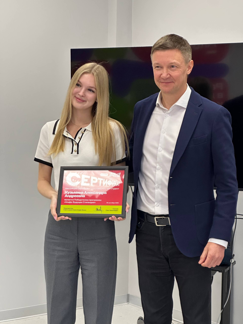 Напомним, что стипендиатами программы «Альфа будущее» стали восемь студентов ИвГУ: Мужжакова Екатерина, Носов Александр, Галстян Арман, Гулиева Айтадж, Кузьмина Александра, Исайчева Дарья, Хранилова Елизавета, Байдала Дарья. В течение 2025-2026 учебного года каждый из них ежемесячно будет получать стипендию от Альфа-Банка в размере 5 000 рублей.