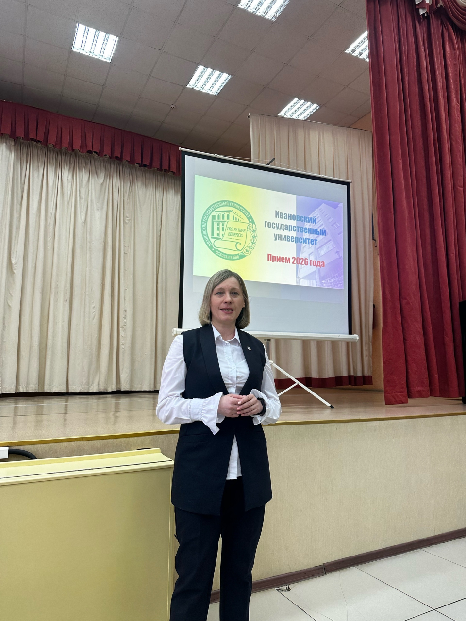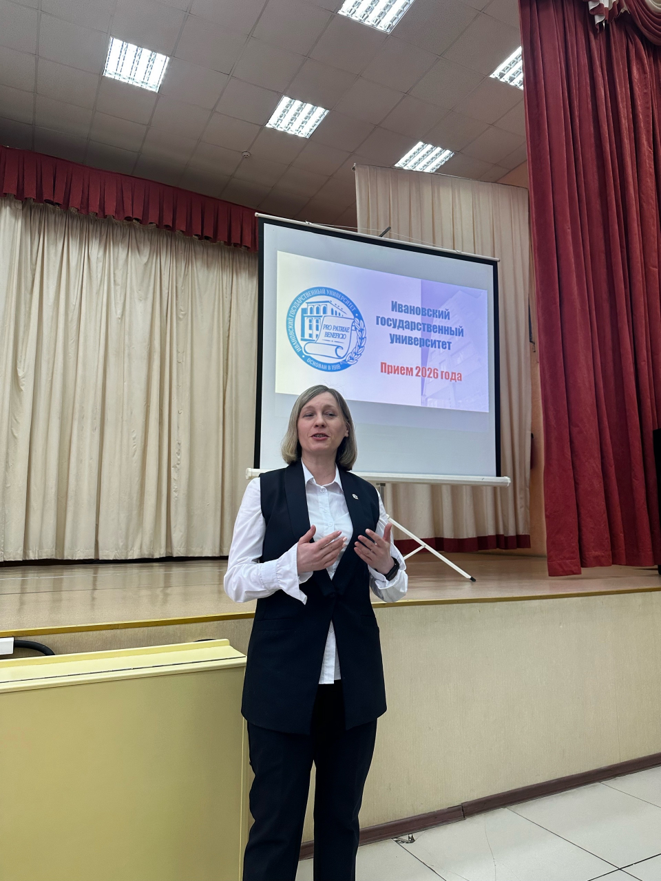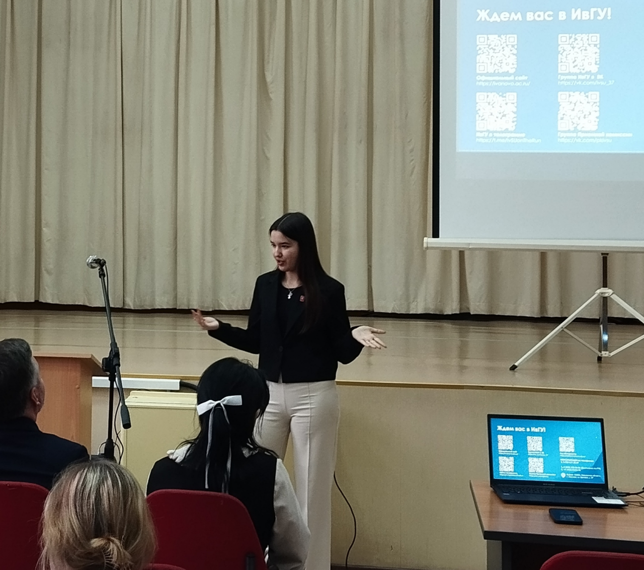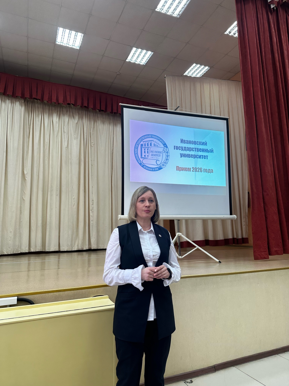 Н.Д. Сорокин рассказал ребятам о структуре и истории развития университета, основных направлениях подготовки, студенческих клубах и объединениях, направлениях научной, общественной, спортивной и международной деятельности студентов. С.Г. Езерская акцентировала внимание на основных источниках информации по поступлению в 2026 году (сайт ИвГУ с разделом Приемной комиссии, портал для абитуриентов – Гид абитуриента), отметила важные даты и особенности приемной кампании, а также указала на возможности получения дополнительных баллов за индивидуальные достижения при поступлении.