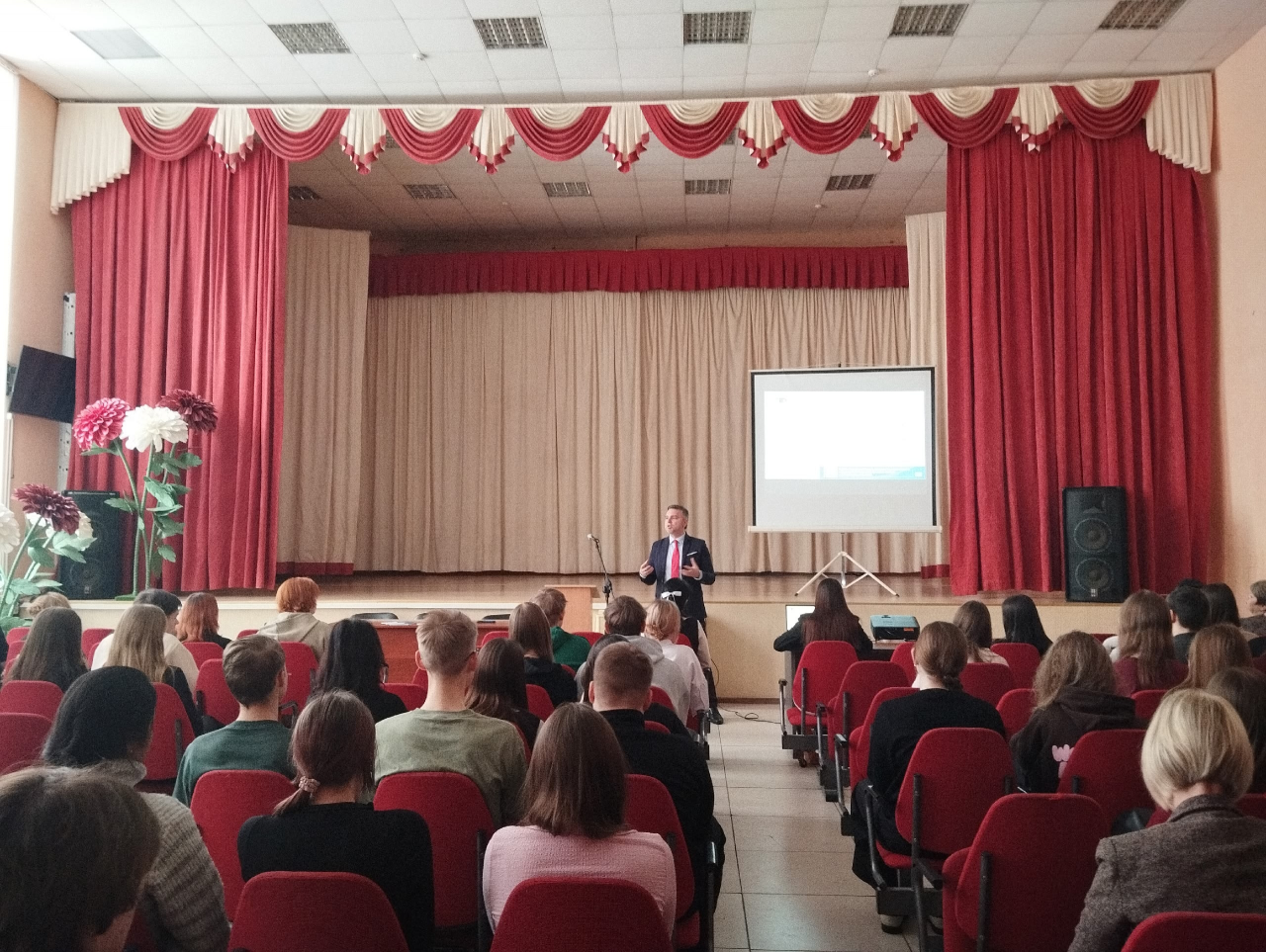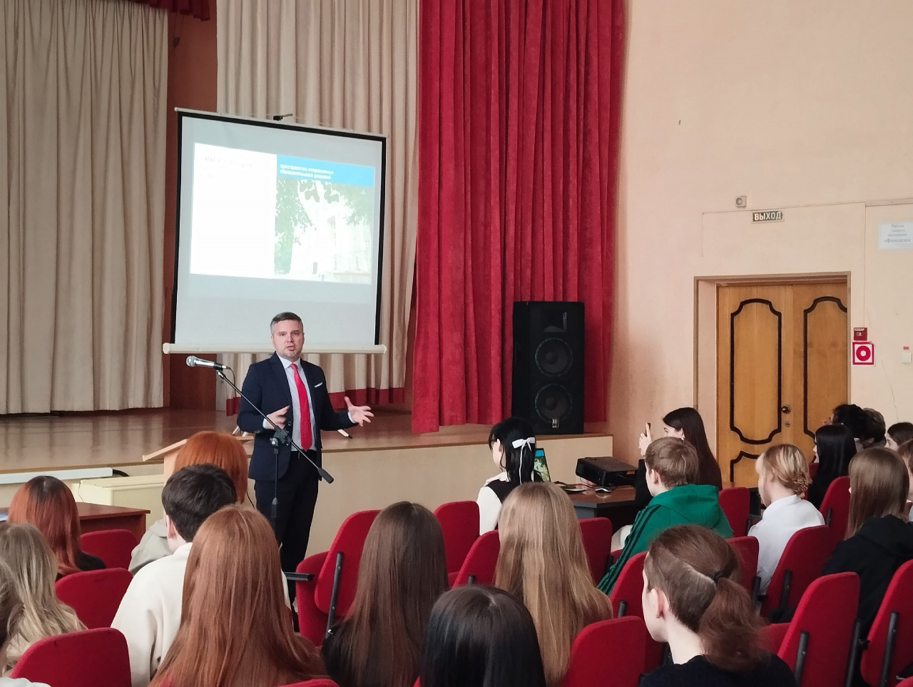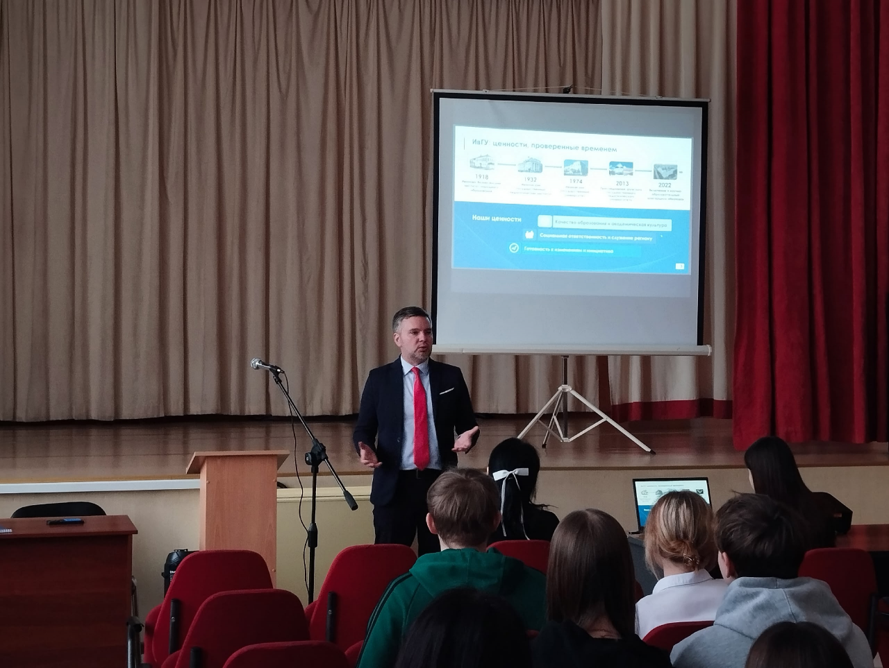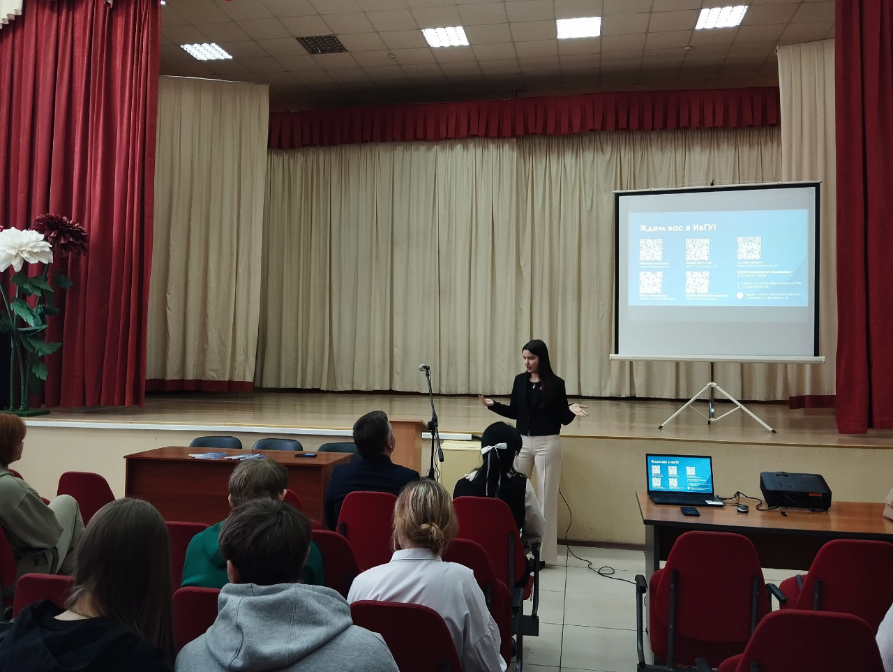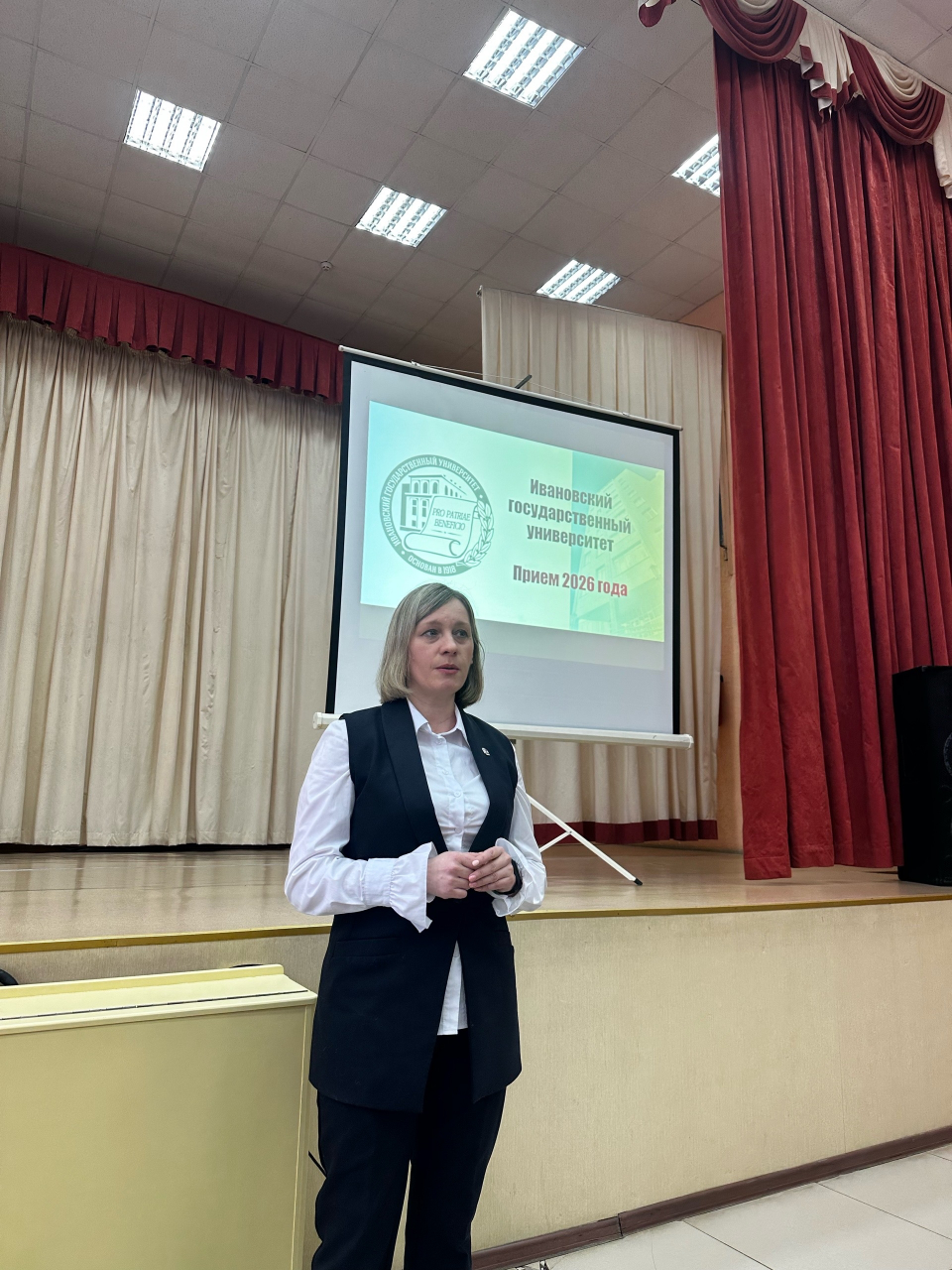 Н.Д. Сорокин рассказал ребятам о структуре и истории развития университета, основных направлениях подготовки, студенческих клубах и объединениях, направлениях научной, общественной, спортивной и международной деятельности студентов. С.Г. Езерская акцентировала внимание на основных источниках информации по поступлению в 2026 году (сайт ИвГУ с разделом Приемной комиссии, портал для абитуриентов – Гид абитуриента), отметила важные даты и особенности приемной кампании, а также указала на возможности получения дополнительных баллов за индивидуальные достижения при поступлении.