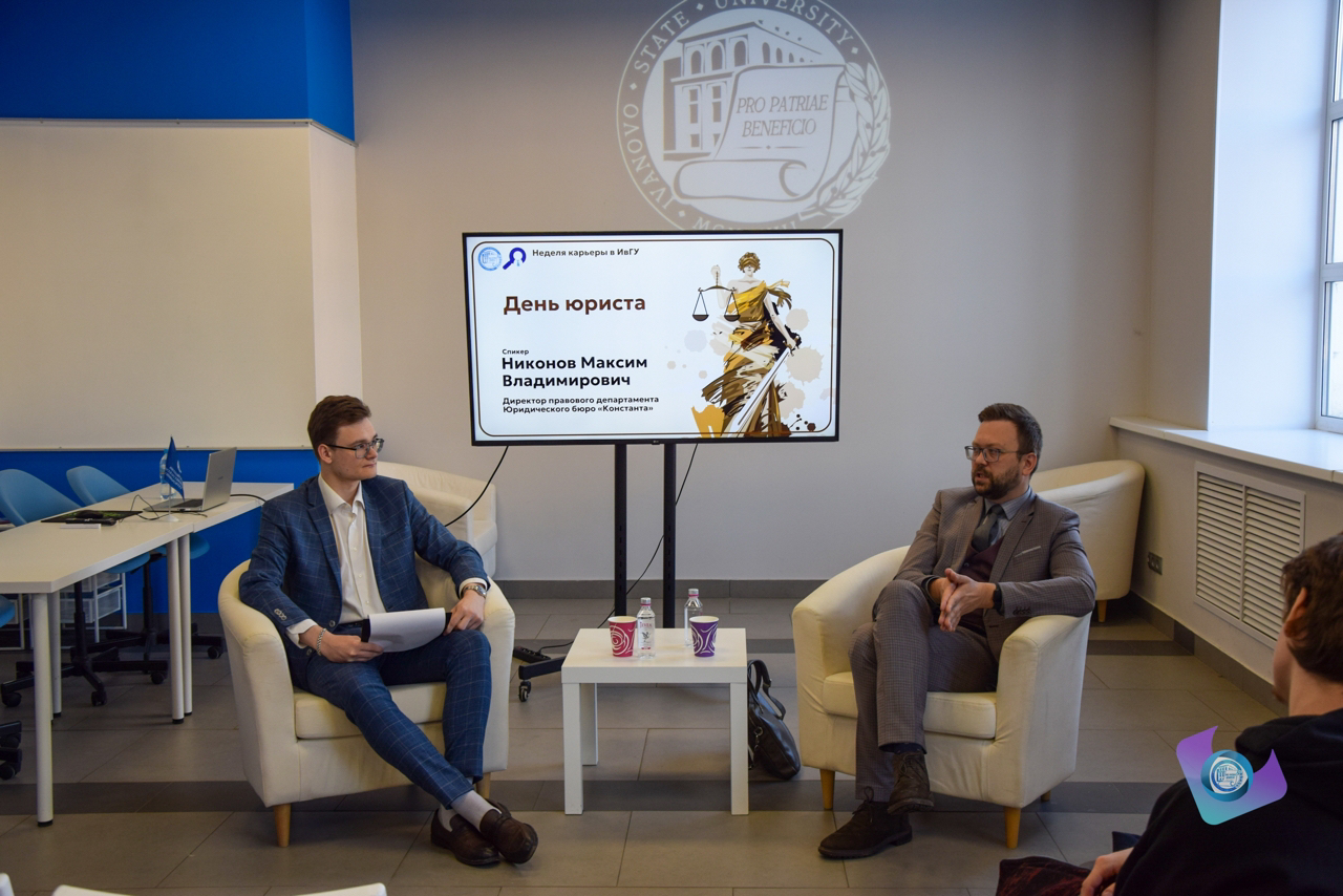 Первая – с Максимом Владимировичем Никоновым, директором правового департамента Юридического бюро «Константа». Он рассказал студентам о своем карьерном пути после окончания университета, о профессиональном становлении и о том, с какими трудностями приходилось сталкиваться, что помогало их преодолевать.