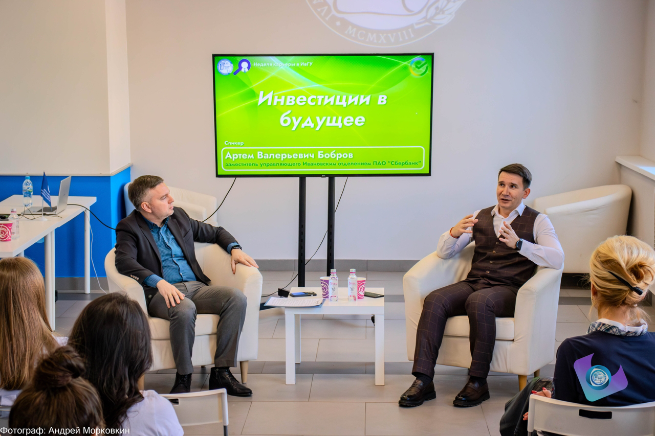 Спикером второй встречи выступил заместитель управляющего Ивановским отделением ПАО «Сбербанк» Артем Валерьевич Бобров. Он поделился со студентами ключевыми трендами развития банковской сферы и возможностями для молодого поколения, подробно рассказал, каких сотрудников преимущественно ищет компания и какие меры поддержки молодых специалистов существуют.