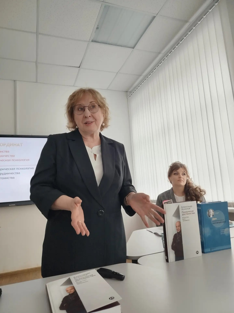 Н. В. Захарова (разработавшая дизайн визуальной поддержки нашей встречи) предложила участникам свой взгляд на одну из идей книги А. Асмолова: «Учитель XXI века — это значимый другой в трех необходимых ипостасях: навигатор, мотиватор, коммуникатор», включила аудиторию в работу мысли, души и сердца, благодаря чему наши коллеги д.ф.н. С.А. Маник, к.ф.н. М.М. Меликян и студенты педагоги-психологи, получившие в подарок книжные закладки с цитатами из обсуждаемой книги, нашли и новые смыслы, и разделяемые ценности, и свой особый опыт понимания жизненного достоинства как образа жизни.