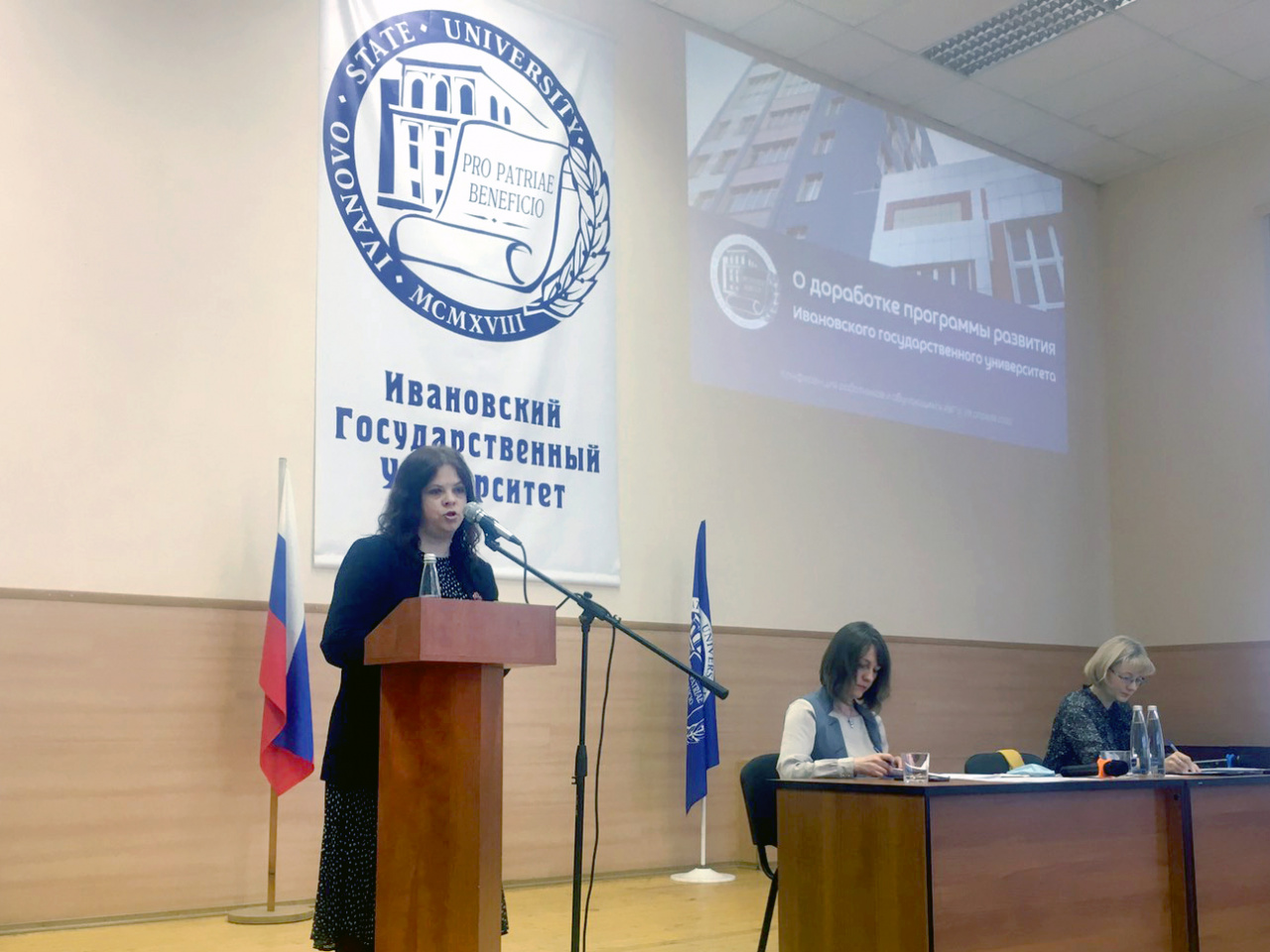 Второй вопрос касался принятия программы развития Ивановского государственного университета на период 2021–2025 гг. Проректор по исследовательской и проектной деятельности ИвГУ Инна Николаевна Смирнова выступила с презентацией о доработке программы развития Ивановского государственного университета в соответствии с рекомендациями экспертного заключения Минобрнауки от 16.03.2021 № МН-7/1988. Она отметила, что коллективом университета была проделана большая работа по усовершенствованию этого важного документа. В результате действий рабочей группы программа развития стала лаконичнее, согласованнее и реальнее.
