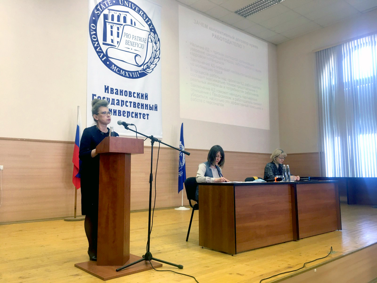 Повестка конференции включала два весьма важных вопроса. По вопросу о принятии решения о заключении коллективного договора по регулированию социально-трудовых отношений между работодателем и работниками Ивановского государственного университета на 2021–2024 гг. выступили первый проректор ИвГУ Ольга Владимировна Кузьмина, председатель Первичной организации профсоюза преподавателей и сотрудников ИвГУ Анна Валерьевна Закорюкина, председатель Первичной профсоюзной организации студентов и аспирантов ИвГУ Ксения Александровна Кумирова.