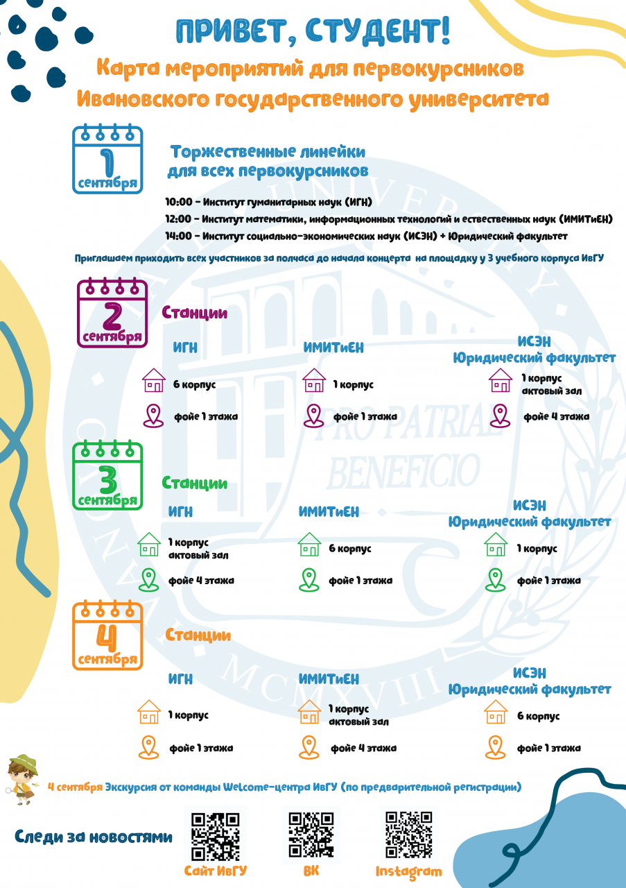 Дорогие первокурсники, каждый день, начиная со 2 по 4 сентября, вас будут ожидать кураторы с табличками направлений подготовки в корпусах ИвГУ согласно расписанию вашего института.