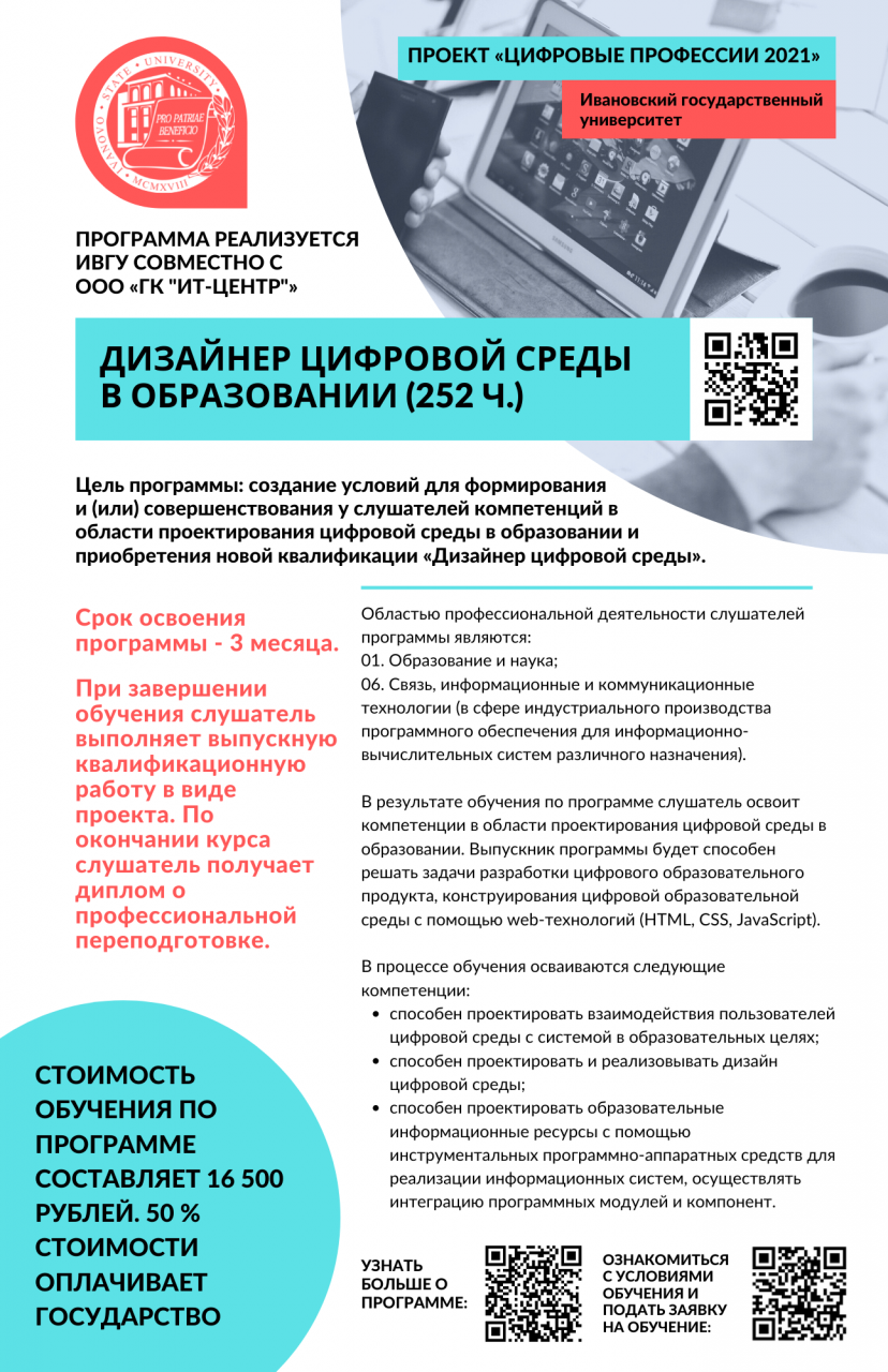 Программа «Дизайнер цифровой среды в образовании» (252 часа): решение задач по разработке цифрового образовательного продукта, конструирования среды образования. Программа реализуется ИвГУ совместно с ООО «ГК "ИТ-Центр"».
