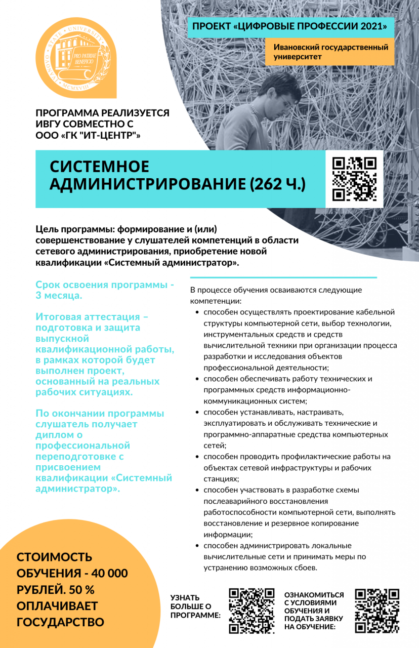 Программа «Системное администрирование» (262 часа): изучение принципов проектирования кабельной структуры компьютерной сети, выбора технологии, инструментальных средств и средств вычислительной техники при организации процесса разработки и исследования объектов профессиональной деятельности. Программа реализуется ИвГУ совместно с ООО «ГК "ИТ-Центр"».