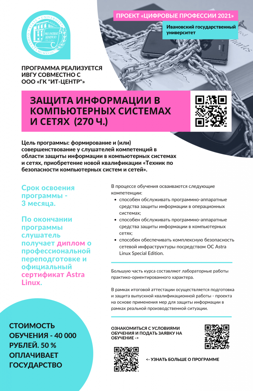 Программа «Защита информации в компьютерных системах и сетях» (270 часов): обслуживание программно-аппаратных средств защиты информации в операционных системах, изучение принципов комплексной безопасности сетевой инфраструктуры посредством ОС Astra Linux Special Edition. Программа реализуется ИвГУ совместно с ООО «ГК "ИТ-Центр"».