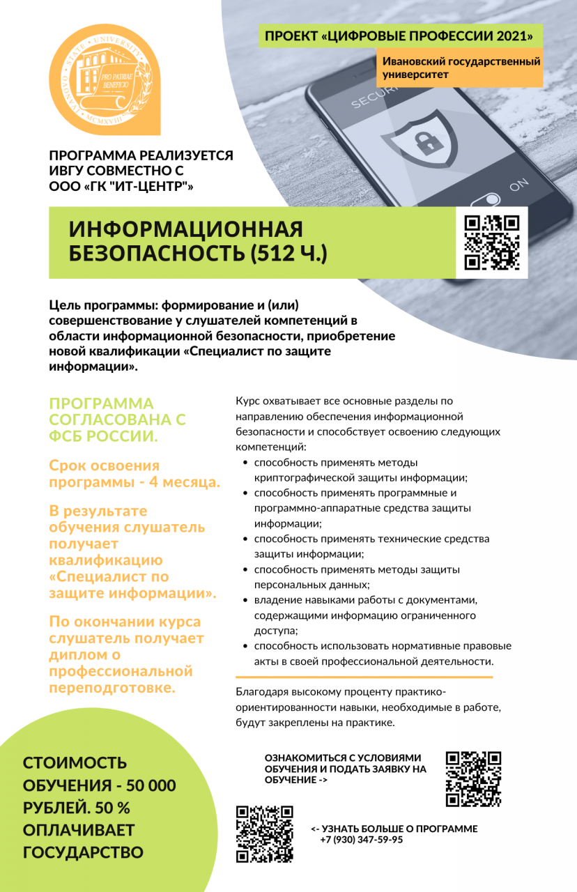 Программа «Информационная безопасность» (512 часов): изучение методов криптографической защиты информации, программных и программно-аппаратных средств защиты информации, методов защиты персональных данных и др. Программа реализуется ИвГУ совместно с ООО «ГК "ИТ-Центр"» и согласована с ФСБ России.