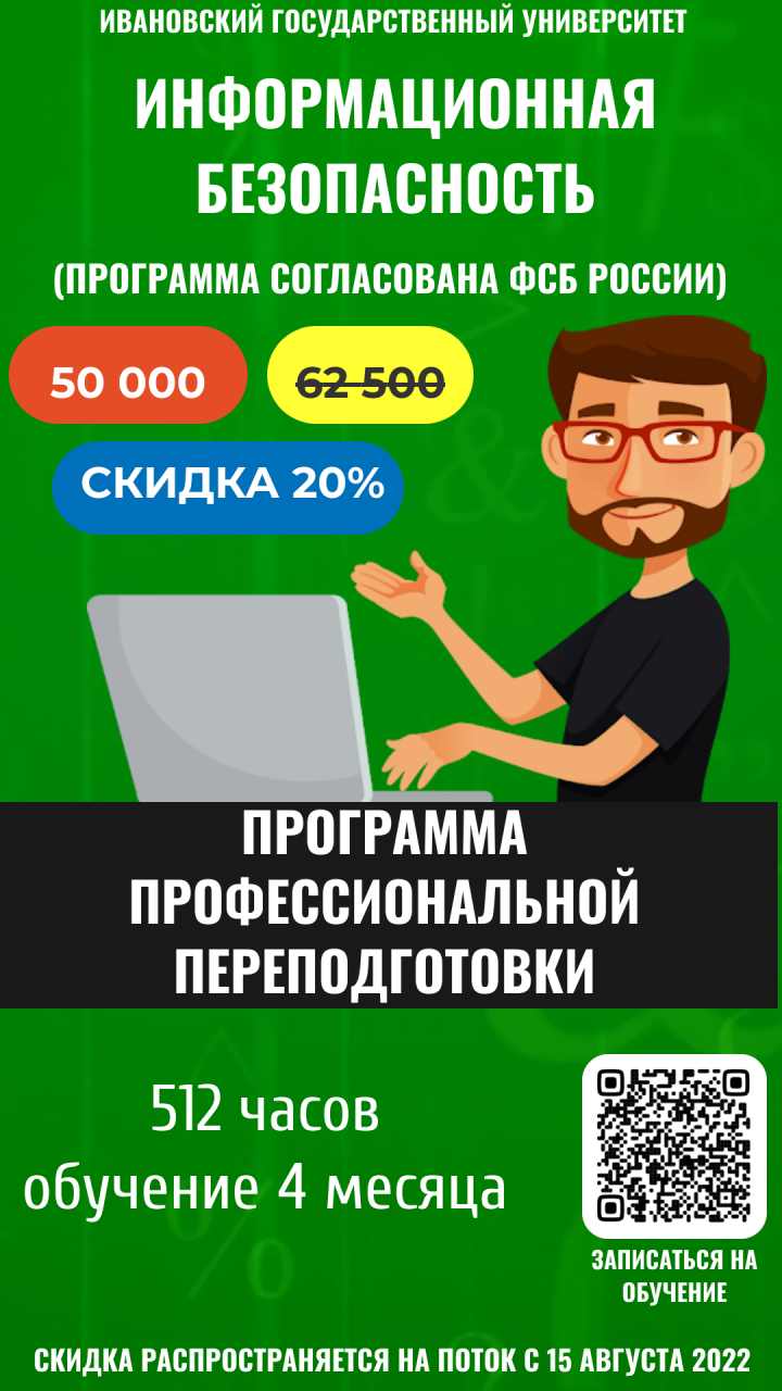 Ивановский государственный университет приглашает пройти обучение по дополнительной профессиональной программе профессиональной переподготовки «Информационная безопасность» (программа согласована с ФСБ России) с 20 % скидкой.